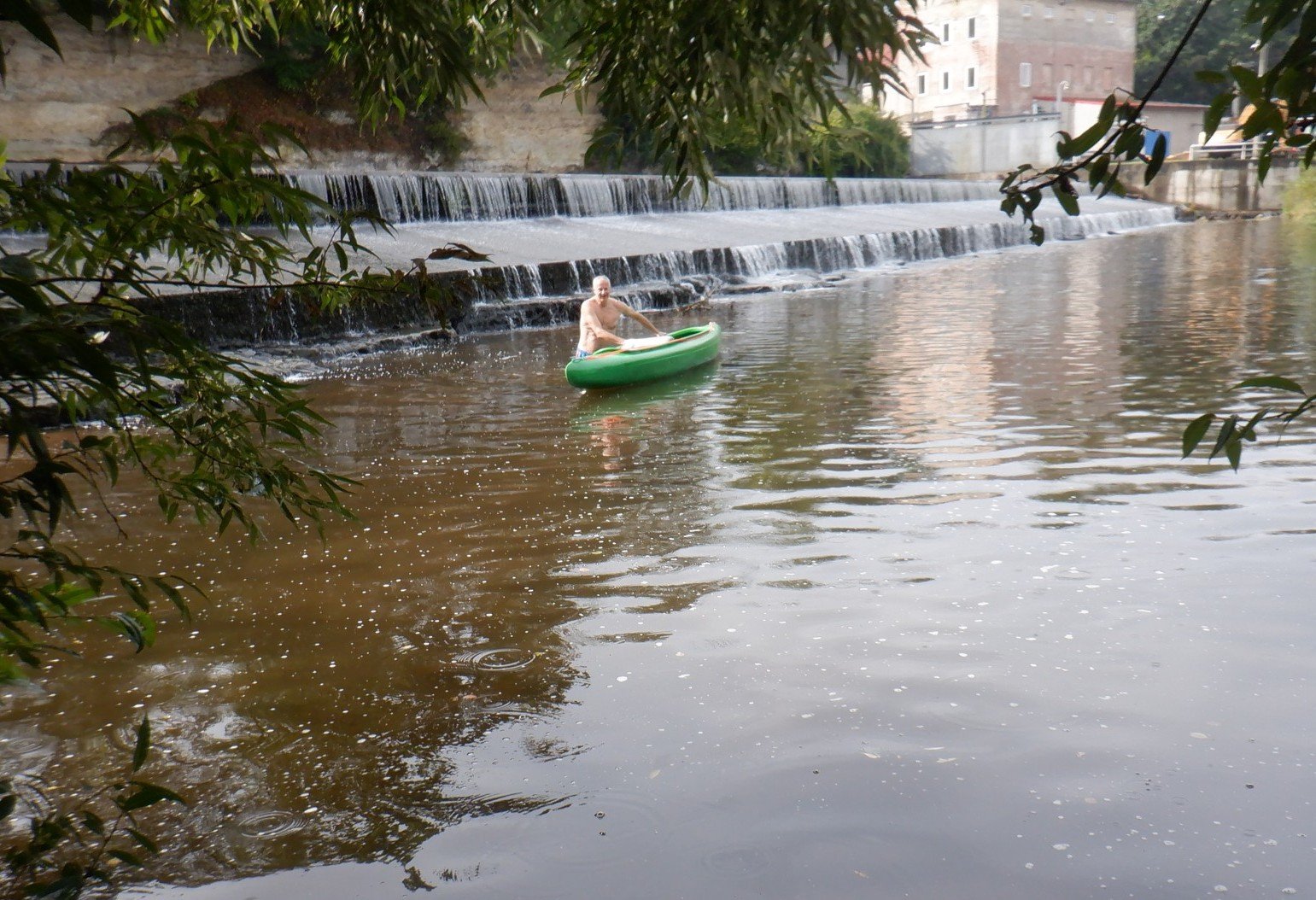 Jez Březina (km 66,6) by možná byl za vyššího stavu sjízdný, ale to není dnešní případ. Přenášíme tudíž napravo.