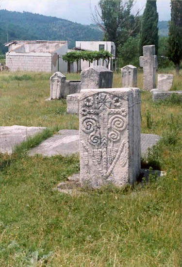 Najdeme je roztroušené v krajině. Někdy jednotlivě, jindy v celých skupinách. Jednou se bělají na holých úbočích hor, podruhé jsou skryté mezi neprostupnými keři. Přibližují tak, v našich krajích nepříliš známou, epochu středověkých dějin. Nazývají se stećci. Píše se desáté století. Bulharský kněz Bogomil ve svých kázáních ostře napadá tehdejší církev a stát, které pokládá za nástroj zla. Pozemský svět líčí, coby dílo Ďáblovo a vyslovuje se pro praktikování asketického způsobu života. Vychází přitom z učení paulikiánů, původně arménské sekty vyhnané právě na teritorium Balkánského poloostrova. Hlavní podstata učení klade důraz na již zmíněný vyhraněný dualismus dobra a zla, s vírou, že teprve až v Kristově evangeliu se objevuje pravý Bůh. Hnutí nachází značnou podporu mezi prostým obyvatelstvem a podle jeho jména dostává přídomek – bogomilství. Hereze se lavinovitě šíří na západ, kde dává vzniknout proslulému katarskému /z řeckého kathos = čistý, se později vyvinul výraz kacíř/ a albigenskému hnutí. Přestože počty přívrženců rostou, všude jsou vystaveni krutému pronásledování, ať už se jedná o země začleněné do západní papežské sféry, či východní byzantské. Jen na jediném místě se mu dostává podpory – ve středověké Bosně. Není přesto známo, kdy tu bogomilství nalezlo živnou půdu, ale roku 1203 byli zástupci bosenských mnichů nuceni se zavázat, že na svém území nebudou trpět žádné odchylky od katolické církve, z čehož vyplývá, že koncem 12. století zde mělo delší čas pevně zapuštěné kořeny. Ačkoli nepřístupná, hornatá a tudíž obtížně kolonizovatelná Bosna, byla formálně podřízena zprvu byzantské, později pak zejména uherské vládě, její vnitřní vývoj probíhal v podstatě zcela samostatně. V první polovině 13. století dochází k intenzivním pokusům o vymýcení kacířství – vysláním dominikánské misie, jejíž cílem bylo pacifikovat Bosnu, počínaje oblíbeným upalováním až k častým vojenským výpravám pod uherským praporem konče. Tato snaha však nepřinesla žádné výsledky a Bosna se de facto stala nezávislým státem. Zárověň tu bogomilové vytvořili vlastní církevní organizaci v čele s „djedem“ /biskupem/. Zmíněné události lze považovat nejen za počátek státnosti, nýbrž i za okamžik zrození bosenského národa, neboť obyvatelé sami sebe chápali nejen jako „dokonalé, pravé křesťany“, ale i jako odlišný slovanský kmen. Přes svůj původní odpor vůči feudálům a šlechtě se zde tato církev stala jedinou náboženskou součástí místního faudálního systému, přičemž udržuje kontakty se svými západními bratry – s katary. Během panování Tvrtka I. /1353-1391/ nastává pro Bosnu „zlatý věk“, provázený, mimo jiné i rozsáhlou územní expanzí, ale jak se často v dějinách stává, po smrti silného vládce propukají rozbroje a říše se utápí v následném chaosu, aniž by domácí šlechta postřehla, že od východu se pomalu, ale nezadržitelně valí další katastrofa. Vnitřních zmatků pohotově využil Štěpán Vukčić, když se roku 1448 prohlásil za vévodu- hercegu a stal se neomezeným pánem jižních částí Bosny, což byl jen další krůček k definitivnímu pádu království. Od oné doby je jeho země nazývána Hercegovinou. Ve chvíli, kdy turecká armáda již dotírá na hranice státu, začíná zaznívat patarenské církvi labutí píseň, neboť v zemi usazený františkánský řád se horlivě ujal rekatolizace. Izolovaným bogomilům zůstala odštěpená Hercegovina. Ovšem ani zoufalé spojenectví s Římem nezabránilo rychlému ovládnutí Bosny Turky. O dvě desetiletí později /1482/ byla definitivně dobyta i Hercegovina, čímž zanikla poslední výspa bosenské církve. Svéráznou upomínkou na její éru jsou právě stećci. V jižní Hercegovině, poblíž osady Radimlja u městečka Stolac, zůstalo zachováno až do dnešních dnů několik seskupení těchto kamenů. Na první a nepřehlédnutelnou nekropoli, čítající několik desítek náhrobků, rozesetých v hájku po obou stranách silnice Stolac – Čapljina, lze narazit krátce po klesání z náhorní plošiny do širokého údolí Bregavy, asi 600 metrů před prvními střechami osady. Pohřebiště patřilo v dobách předválečných k hojně navštěvované turistické atrakci, o kterou bylo náležitě pečováno – na několika kamenech jsou poznat stopy citlivých rukou restaurátorů. Nyní se mezi pomníky spokojeně popásají ovce a po komunikaci, dělící areál, vrčí obrněné transposrtéry SFOR, což s pietně-venkovskou atmosférou místa vytváří příznačný obraz současné Bosny, korunovaný vypáleným domkem na pozadí. Připočteme-li ještě vedlejší, zbrusu nový „umělohmotný“ obchod, vyrůstající uprostřed zelené louky, s rozšklebenou kulisou skalisek, odkud je do vesnice na míle daleko, dostaneme podobu celkovou. Náhrobky nejsou jednolité, nýbrž vykazují bohatou škálu tvarů. Jako surovina byl použit místní vápenec. Od kvádrů, přes kameny podobné tumbám, známým ze židovských hřbitovů, až po zdobené kříže. Také rozměry jsou odlišné. Ty nejmenší jsou sotva metr dlouhé a do půl metru vysoké, ty nejvyšší - obří bloky, skýtají nevšední rozhled. I reliéfní výzdoba je poměrně pestrá, byť poněkud primitivní, často se objevuje motiv kříže, respektive ukřižovaného Krista, u paty přecházejícího v kotvu, po stranách lemovaný vinnými hrozny, dále dvě hrubě vysekané postavy, či spirály, o nichž existuje domněnka, že se může jednat o relikt předkřesťanské symboliky. Boční strana prozrazuje události světského života, např. 