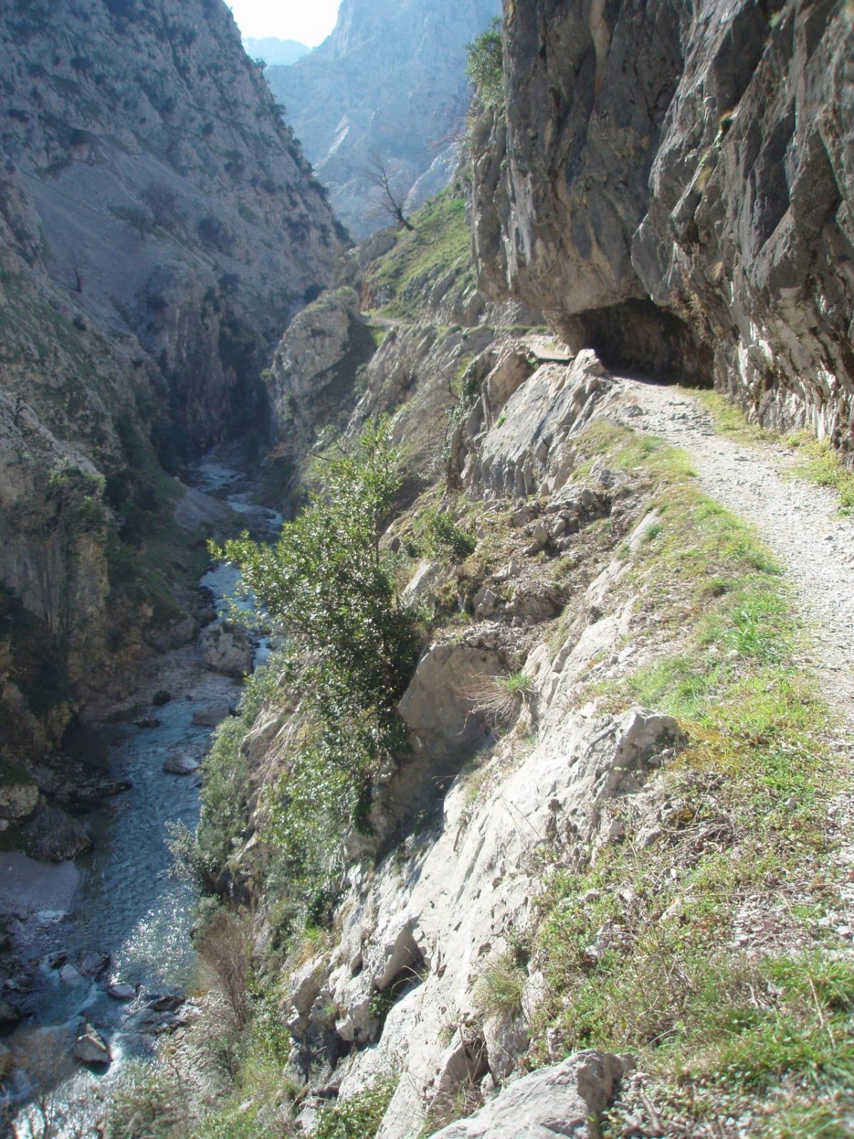 Turistická cesta z Poncebos do Caín patří totiž k tomu nejkrásnějšímu, co příroda v Picos de Europa svým návštěvníkům připravila. Kaňon Garganta del Cares je opravdu úchvatná soutěska. Hloubka kaňonu dosahuje až několika set metrů a ze stezky široké občas necelý metr a zaříznuté vysoko v úbočí skály se nám nabízí ty nejúžasnější scenerie, jaké si jen lze představit. Sousedící masív Cerredo překonává dno kaňonu dokonce o více jak dva kilometry! Napříč soutěskou vede pečlivě vyvedená a ve skále odvážně vystřílená cesta, která byla vybudována hydrografickou společností v souvislosti se stavbou vodního koryta přívodního kanálu do elektrárny, která leží nad Poncebos. Výstavba kanálu probíhala v letech 1915 až 1921. Vedlejší úlohou kanálu bylo právě propojení vesnic Caín (autonomní oblast León) a Poncebos (Asturie). Postavit kanál se spádem pouze 1:1 000 a sousední cestu muselo být v tomto těžkém terénu hodně složité. Původní plány výstavby se několikrát měnily. Ručně bylo potřeba razit až 71 tunelů. Pracovalo zde 500 lidí a stavba si vyžádala 11 obětí. Když návštěvník kaňonu prochází kolem tohoto neskutečného vodního díla, které se proplétá jako had okolo a uvnitř skal, nestačí se divit, co je schopen člověk ne jenom vymyslet, ale i vybudovat. Avšak i pohledy dolů připadají někdy jako neskutečné. Občas klidná říčka vytváří lesklé plochy vodní hladiny, aby ji po chvíli vystřídali malé vodopády. Jinde se pomalu plynoucí vodě postaví do cesty shluky mohutných skalisek.