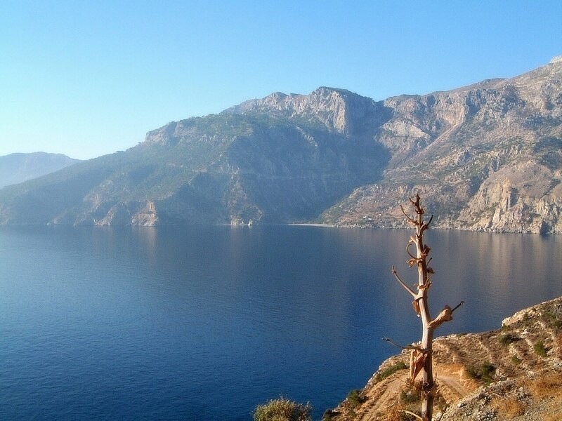 V autě se pokouším rozmasírovat bolavá stehna, ale je to marné. Panda si spokojeně oddychne, že jej necháme odpočinout v zátoce Adia nedaleko taverny Pine Tree. Hned naproti odbočce k taverně navádí turistická značka ke vstupu do soutěsky Flaskias ty pošetilce, kteří nedbají ohlašujícího se vedra. Hádejte, kolik jich tak asi může být. Míjíme skalní stěny, které nám vzdáleně připomínají majestátnější Samarii na nedaleké Krétě, ovšem bez lidského hemžení, cestou nasloucháme jen zpěvu ptáků, obdivujeme pestrobarevné motýly a jedinými souputníky jsou nám plaché kozy. Dvakrát překračujeme vyschlé koryto potoka ukryté v houštině vzrostlých oleandrů, sem tam zdobených čepičkou posledních květů. Cesta nás vede dál borovicovým lesem, stoupá čím dál strměji, až se ocitneme na otevřené kamenité stráni. Šnečím tempem nám do těchto míst cesta trvala asi dvě hodiny. Odměnou budiž nádherný pohled na jihozápadní pobřeží.