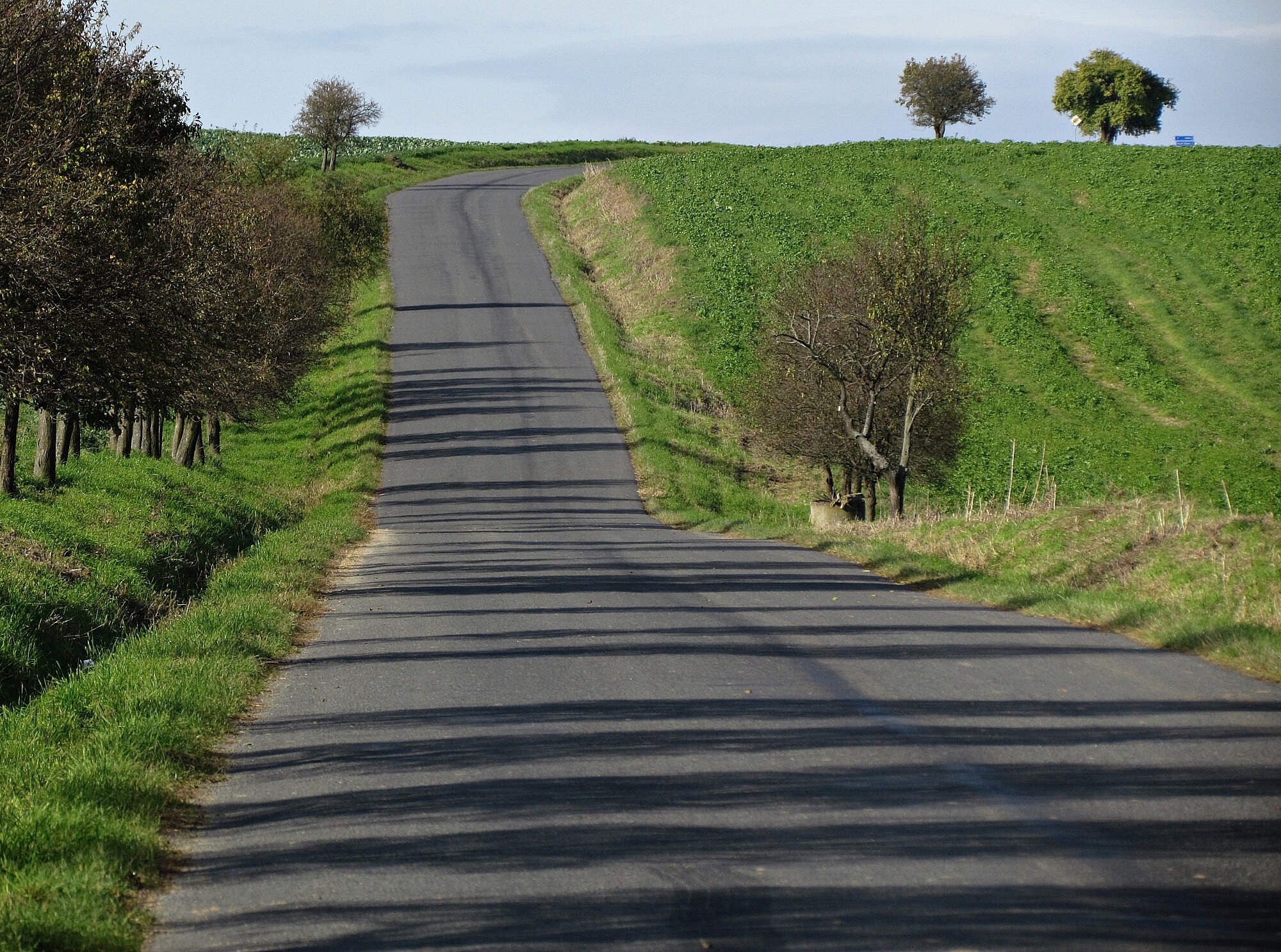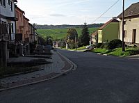 A tady jsem cestou konečně narazil na první místní „živáčky:“ Tvorové měly podobu urostlé Romky středního věku táhnoucí za sebou vozík a kočky věku neurčitého ji doprovázející. Žena mne pozdravila (pyšné zvíře ne), no a nahoře za hřbitovem už bylo definitivně po klidu, neboť jsem až do vzdálených Těšnovic musel pochodovat po dosti frekventované silnici...