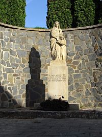 Nad horním koncem dědiny jsem narazil na další místní pamětihodnost – sochu sv.Anny i s její malou dcerkou Marií, vztyčenou tu roku 1944. Skulptura je umístěna na plošině nižší kamenné zídky a přístupna širokým schodištěm. Za terasou vystupuje na obou stranách mnohem vyšší opěrná zeď, která za sochou vytváří půlkruh, díky čemuž lokalita připomíná menší amfiteátr. Nad vyšší zdí vystupují koruny v řadě zde stojících tůjí. Současná podoba sv.Anny pochází z roku 1969. Předtím totiž skulpturu po deštích postupně ničily vodní přívaly a v základech poškodily. O její renovaci spolu s úpravou okolí bylo rozhodnuto v období „Pražského jara“, kdy nic nenamítali dokonce ani komunisté. Ostatně – finance na opravu si ve dvou sbírkách místní věřící stejně zajistili sami!