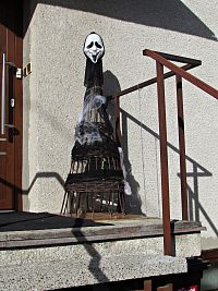 Od sochy jsem pěšinou v pastvině vystoupil na hřeben ke kříži, o němž jsem se zmínil již na začátku článku, potěšil se okolním širokoúhlým výhledovým panorámatem a po polní cestě klesal k prvním domkům Karolína. Tady po rázném příkazu z mozku učiněno „vlevo vbok!“ a chodníkem lemovaným značkami místních okruhů sestup pastvinami do bařického lesa. Úzká lesní cesta nějakou dobu trochu prudčeji klesala hvozdem a v místech, kde měla už jen nepatrný sklon a široká byla skoro jako průsek, najednou proti mně mezi stromy ve výši pouhých dvou metrů nad cestou šílenou rychlostí letěl hororový přízrak!