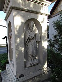 Na první křížovatce jsem minul na nároží vpravo umístěný starý kamenný kříž. Zatímco jeho sokl je na všech světových stranách ozdoben nikou se sochou světce a nahoře završen bohatě profilovanou římsou, vlastní krucifix s pozlaceným ukřižovaným Kristem má prostinkou podobu.