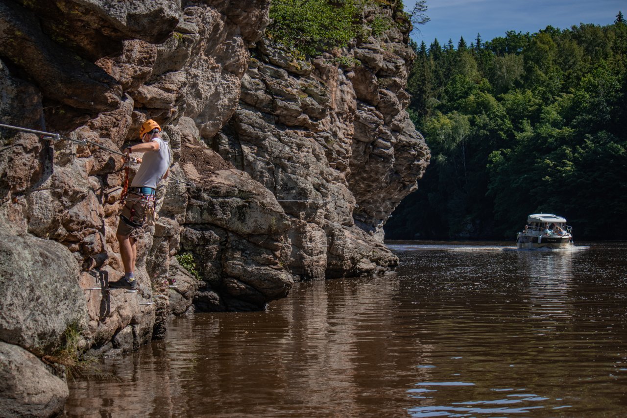 Lezení na zajištěných cestách jsme si poprvé vyzkoušeli v Alpách, kde je hustá síť ferratových stezek. Naštěstí už i v tuzemsku vznikají nové ferraty, a tak je potřeba otestovat jejich kvalitu. Při letošní dovolené v jižních Čechách jsme vyzkoušeli Ferratu Hluboká, nejdelší ferratu nad vodní hladinou v České republice.