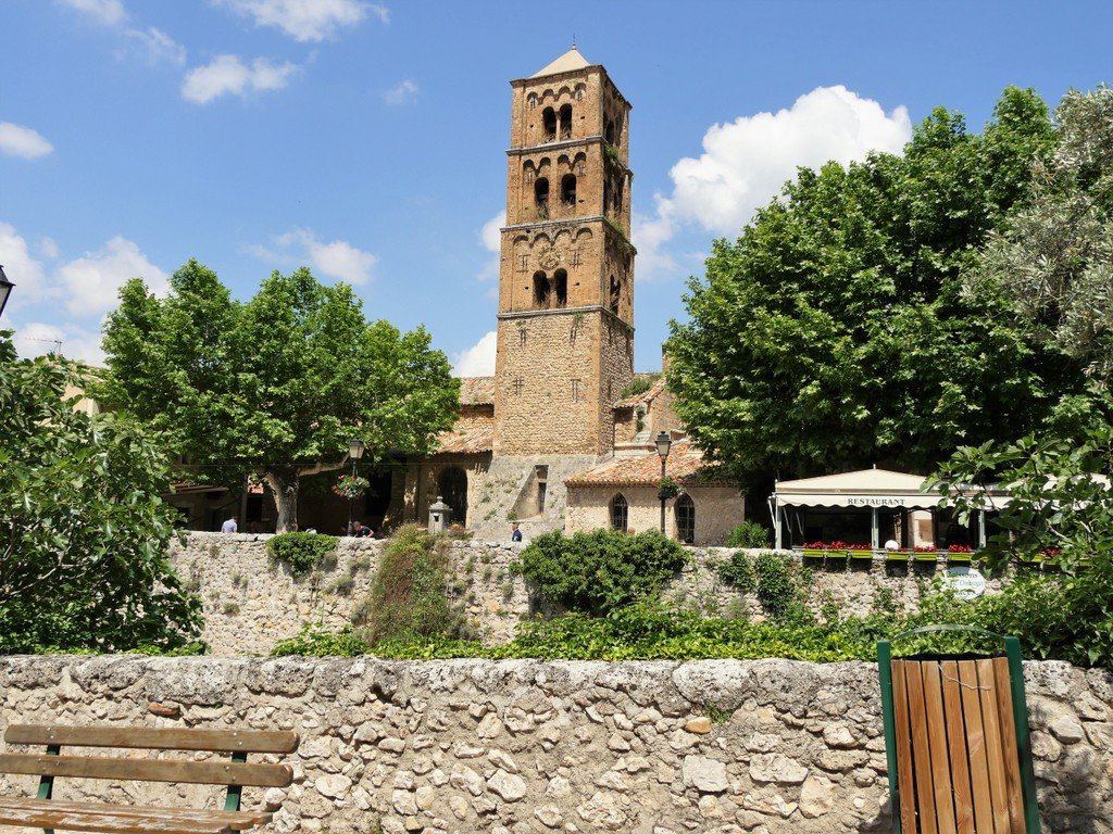 Vystupujeme do ulice na východní straně obce a jdeme do jejího středu. Alej stromů poskytuje příjemný stín a několik kašen nabízí osvěžení chladnou vodou. V okolí je řada obchůdků a restaurací a tak to pokračuje až do nejživější ulice. Tady se to již rojí turisty i přesto, že teploměr se vyšplhal nad 26°C. Při pohledu na skály nad námi a prudkou říčku La Maire se dá říci, že ves byla postavena v dosti prudké strži. Okolí hýří květy, které jsou snad všude. Procházíme na malé náměstí, na jehož jižní straně stojí románský kostel Notre-Dame-ĺ Assomption.