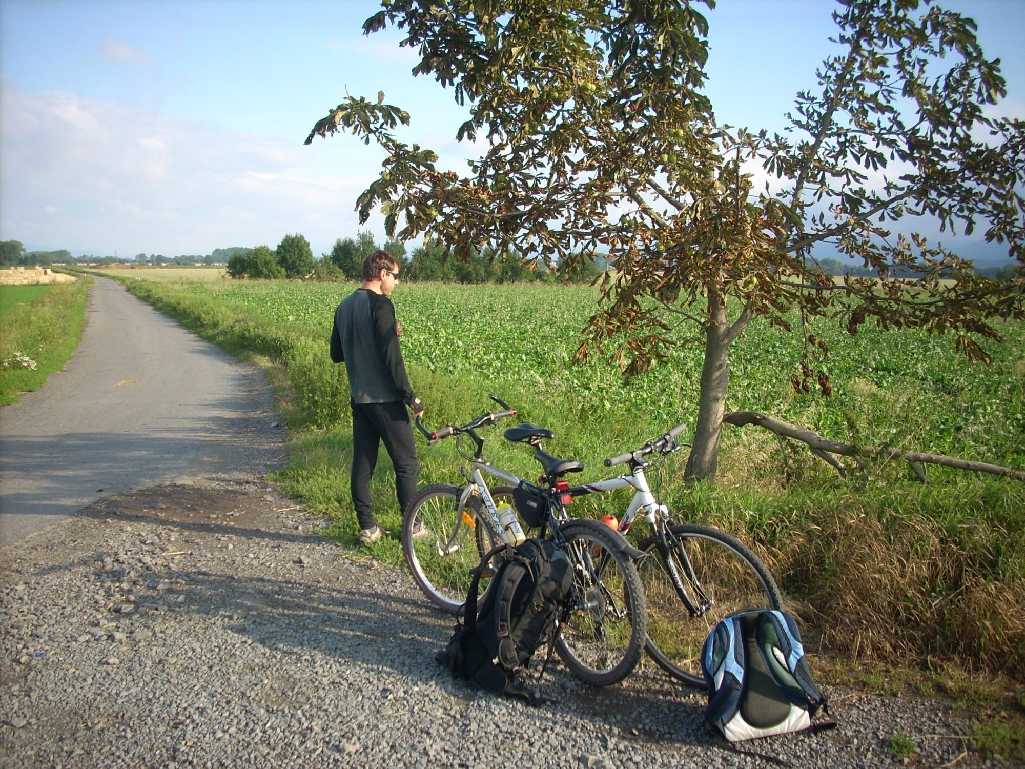 Pohodlí domova opouštíme v sedm hodin ráno. Zásobeni vodou, sladkostmi, slunečními brýlemi, větrovkou a nějakou tou korunou se začínáme proplétat zatím ještě spícími ulicemi Olomouce směrem na Šternberk. Hlavní cestu vedoucí z hanácké metropole do Šternberka kvůli nebezpečnosti a velkému provozu zavrhujeme. Raději volíme poklidnou cestu přes Štěpánov. Projedeme Liboší a za vesnicí Hnojice se mezi poli s balíky slámy rozhodujeme dle hesla – co můžeš sníst hned, neodkládej na zítřek, pro první přestávku. Zatím je nám docela hej, rovinatá Haná nás, co se kopců týče, moc neprověří. Pomalu ale začíná sílit vítr, a jak už bývá pravidlem, fouká vždy proti cyklistům. Šternberk objíždíme a na cestu Šternberk - Paseka se napojujeme ve vesnici Komárov. Z Paseky míříme do Dlouhé Loučky, za kterou se dostáváme na inkriminovanou křižovatku a klademe si otázku. Vydáme se dle plánu do Rýmařova přes Sovinec nebo pojedeme raději v závětří přes Ondřejov? Cesta přes Sovinec je sice náročnější, ale rozhodně zajímavější na výhledy a různorodost terénu – chvíli z kopce a chvíli zase do kopce a tak pořád dokola. Kvůli větru se po hlasování – jedna ku jednomu, demokraticky rozhodujeme pro druhou alternativu, dojet do Rýmařova přes Ondřejov. Nebudeme sice tolik vystaveni větru, ale nekonečná cesta do táhnoucího se kopce v délce několika kilometrů, psychice zrovna nepřidá. Vzájemně se hecujeme slovy – nenadávej a šlapej, ještě tak čtyřicet kilometrů do kopce a pak pofrčíš z kopce.