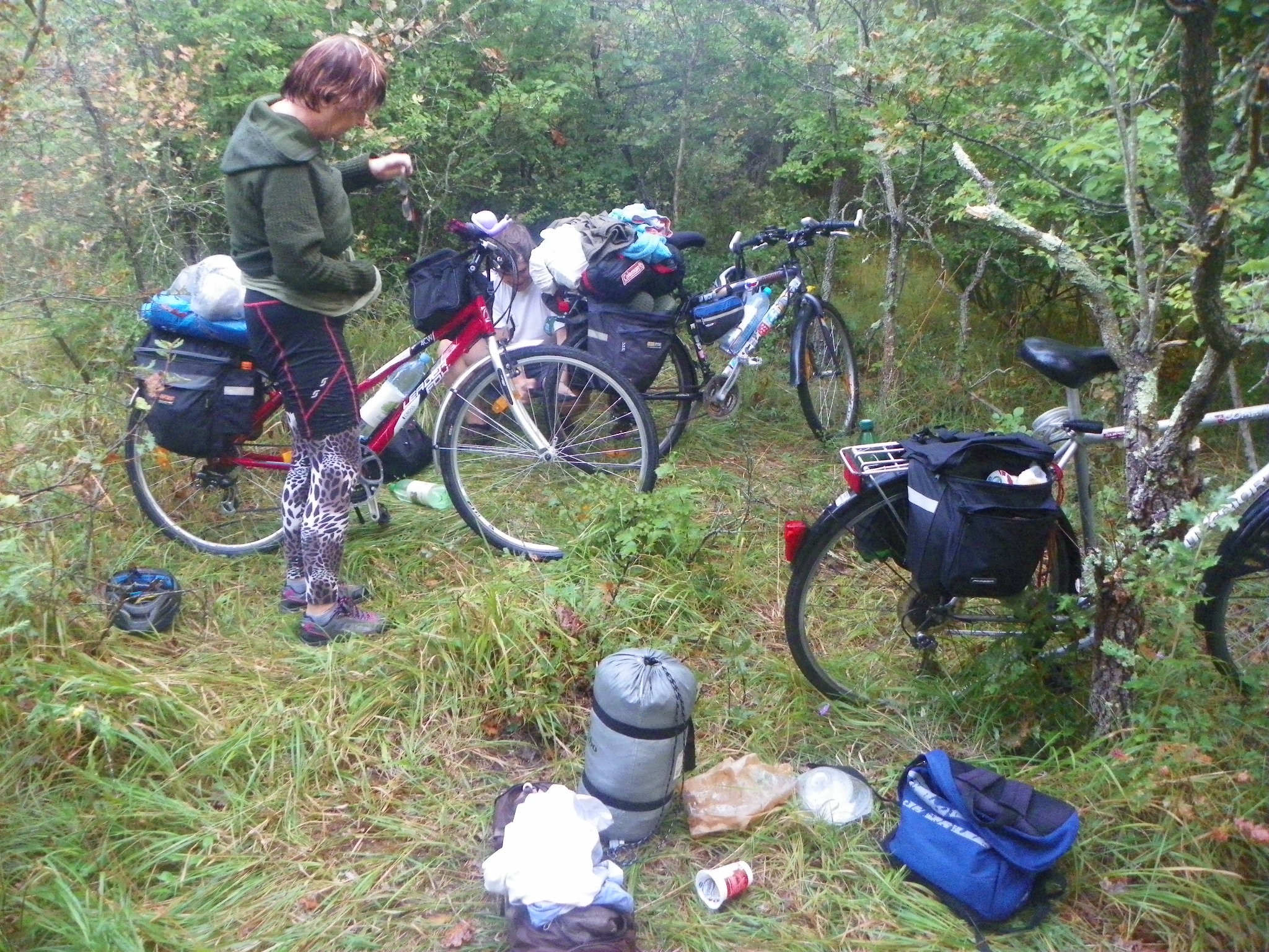 Moc jsme se do rána už nevyspali. Věci zůstaly suché, déšť nebyl silný. Plánovali jsme výjezd v půl 7, ale vyjeli jsme až v 9, protože Jája spravoval kolo. Včera píchl a měnil duši. Měl u toho plno průpovídek, že u starých kol se duše vyndavaly z pláště snadno, teď že jsou tak připevněné, že při výměně ji stejně protrhne. Ivan pomáhal, duše zaplula na své místo bez potíží, spojili jsme opravu se snídaní, takže jsme vyjeli na silnici už za plného provozu.