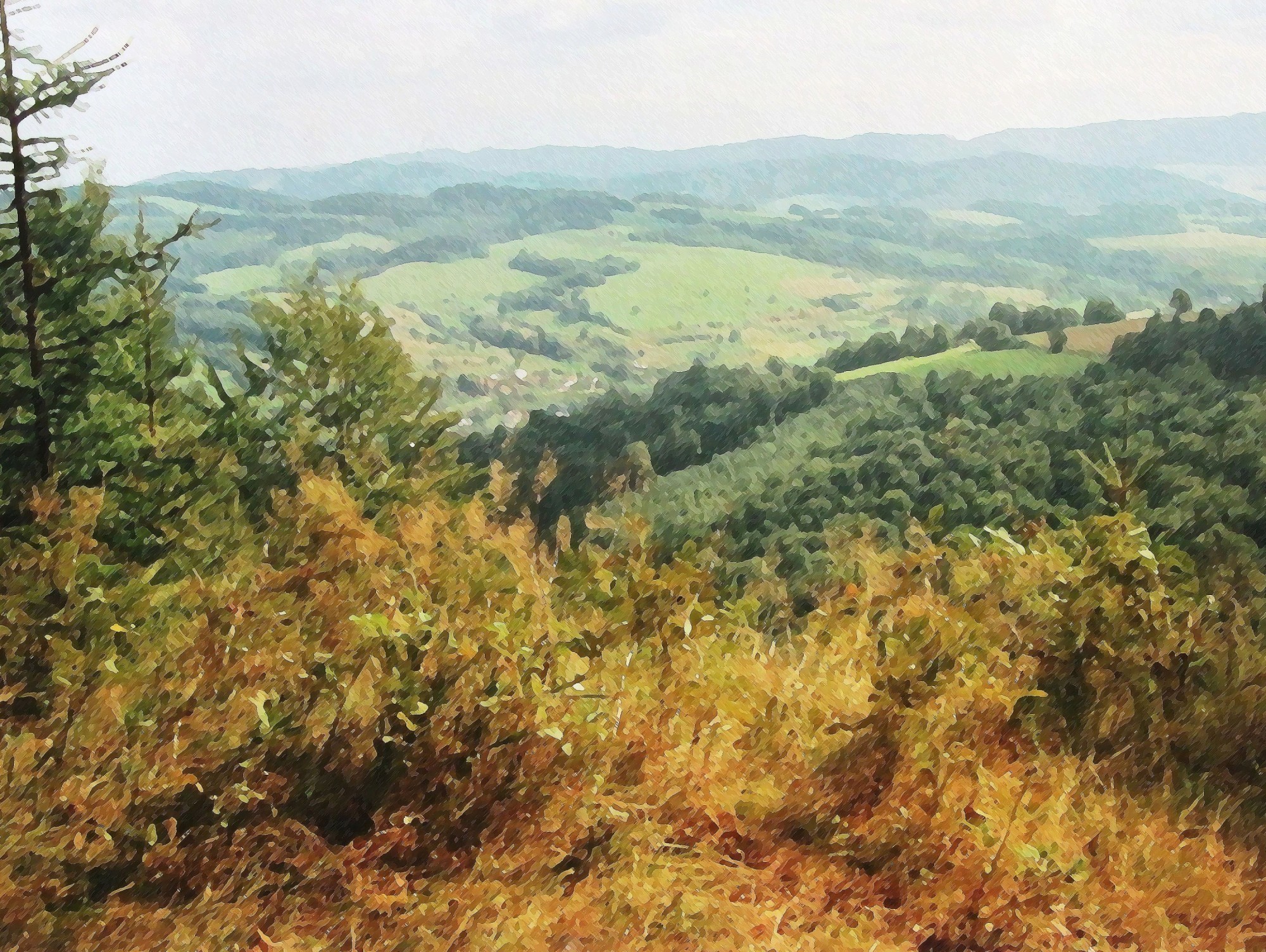 Začíná ňa cosi zlobit levá hnáta, konkrétně kolenisko - při každém došlápnutí Ostrá pronikavá bolesť - gdyž sa lézlo navrch do kopca, tož to tolik nevadilo !! Pak zaséjc přes lúku na vrcholu kopca bez ména a z kterého je ten výhled skorem na půl jižního Valašska. Týmto ho křtím na "Rajsků vyhlídku" - šak nemosíja jich mět enom Čecháčci, aj tady je to okolo všady moc krásné ... A zvlášť včil, gdyž zrovna zapadá slunko. Ale podlevá našich je to na Březovéj nad Brumovem u kapličky "U Cyrilka" pěknější !!