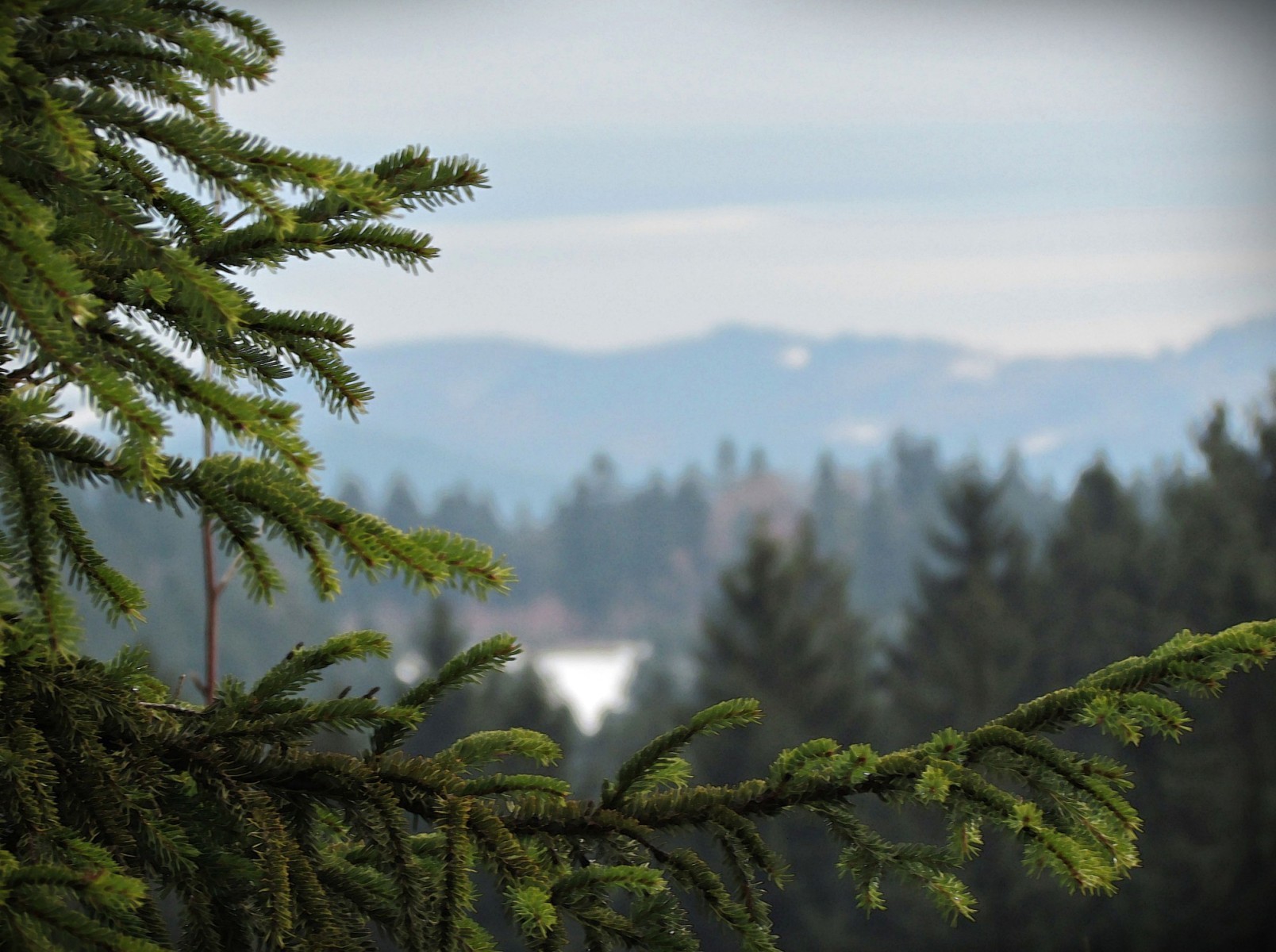 Za posledním stavením vede polní cesta do údolíčka k okraji lesa s malým rybníčkem. Nejenomže prší, ale navíc je tato cesta pokryta ledovicí a moje staré kanady postrádají brzdné destičky. Člověk musí dát veliký pozor, aby tady nezahynul při pádu o zem bídnou smrtí !! Od jezírka cesta stoupá lesem a tady už je to naštěstí bez ledu a na člověka tolik neprší. Z návrší se otvírá poslední pohled na dědinu Pozděchov a okolo v lese stromy se zajímavými kořeny a tak rychle z batohu vylovit také kňourající foťák ! Lesem přecházím přes horní konce dvou údolíček. Za tím druhým je cesta pokryta nejen vrstvou ledu, ale i bláta, takže je aspoň z čeho si vybrat, po čem člověk pošlape. Míjím velkou zákrutu s pomníčkem sv.Huberta a informačním panelem a pak už sestup do hluboké doliny Trubisek - k opravenému výletnímu areálu s loveckým zámečkem a stylovou dřevěnicí Mysliveckého sdružení Pozděchov.