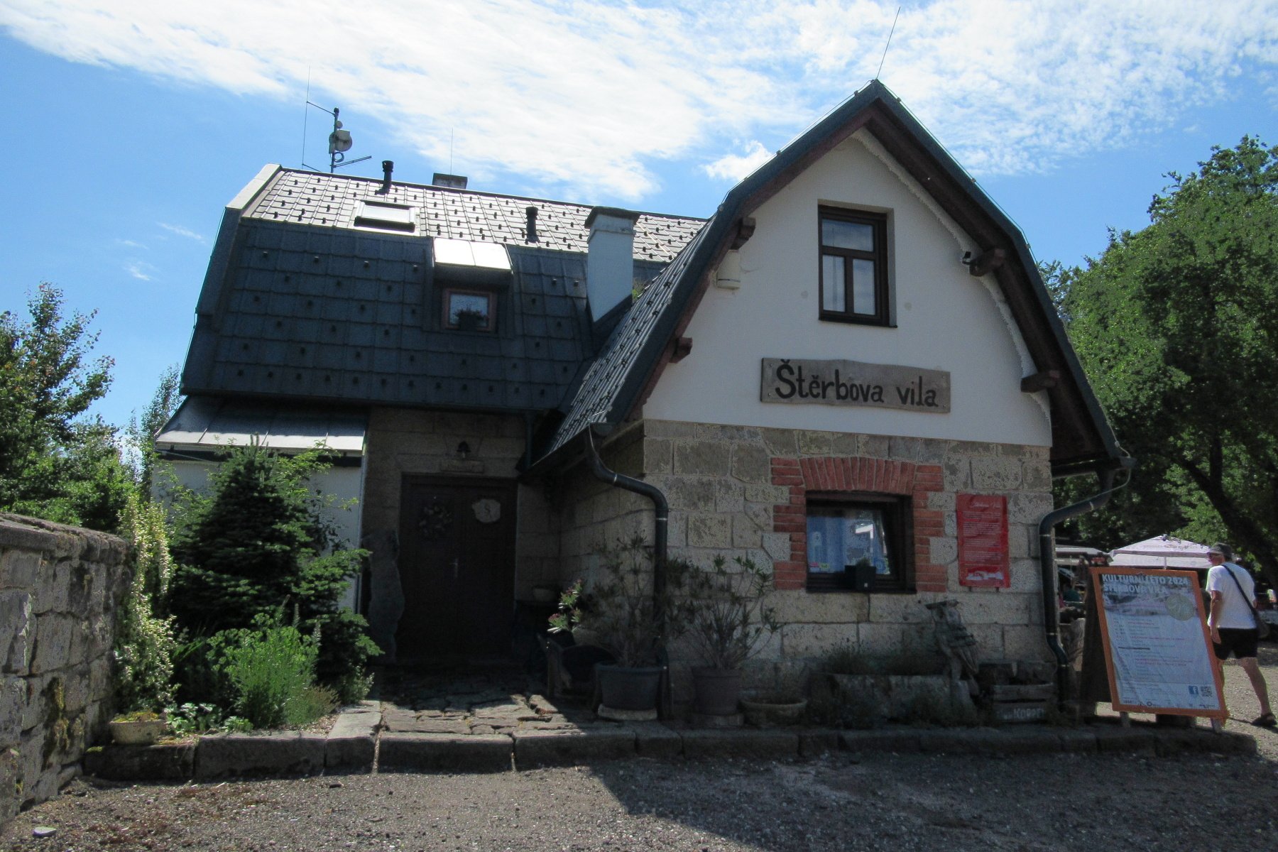 Současně jsme si přečetli, že se občerstvujeme na zahradě historické Štěrbovy vily, která byla postavena v letech 1916 - 1919. Tu si postavili bratři František a Emil Štěrba, aby tady mohli žít se svými rodinami a odtud řídit stavbu přehrady. Je postavena ze stejných kvádrů jako přehrada. Nad vchodem do vily má být ručně tesaný nápis "1874 Výlet Sokola Královedvorského". Jenže ten jsme nenašli. Vila byla ve vlastnictví rodiny Štěrbů až do 50. let 20. století, kdy byly nuceni vilu prodat, prý dost možná z důvodu měnové reformy r. 1953. Noví majitelé vilu používali jako odpočinkové sídlo až do r. 1989. Další majitel ji měl jako letní a víkendovou chalupu až do r. 2016, kdy ji koupil nynější majitel. Objekt částečně zrekonstruoval a umožňuje tak celoroční ubytování. Nabízí i občerstvení vč. domácích pochutin z kamenného grilu a udírny. Udělal revitalizaci přilehlé zahrady. Tento venkovní prostor slouží v létě i ke kulturnímu vyžití, např. ke koncertům. Vila má dokonce vlastní původní 20 m hlubokou studnu, stále funkční, s přečerpávacím zásobníkem, který je ve skále hluboko pod pískovcovým klenutým sklepem vily. Je tam také Informační centrum města Dvora Králové nad Labem.