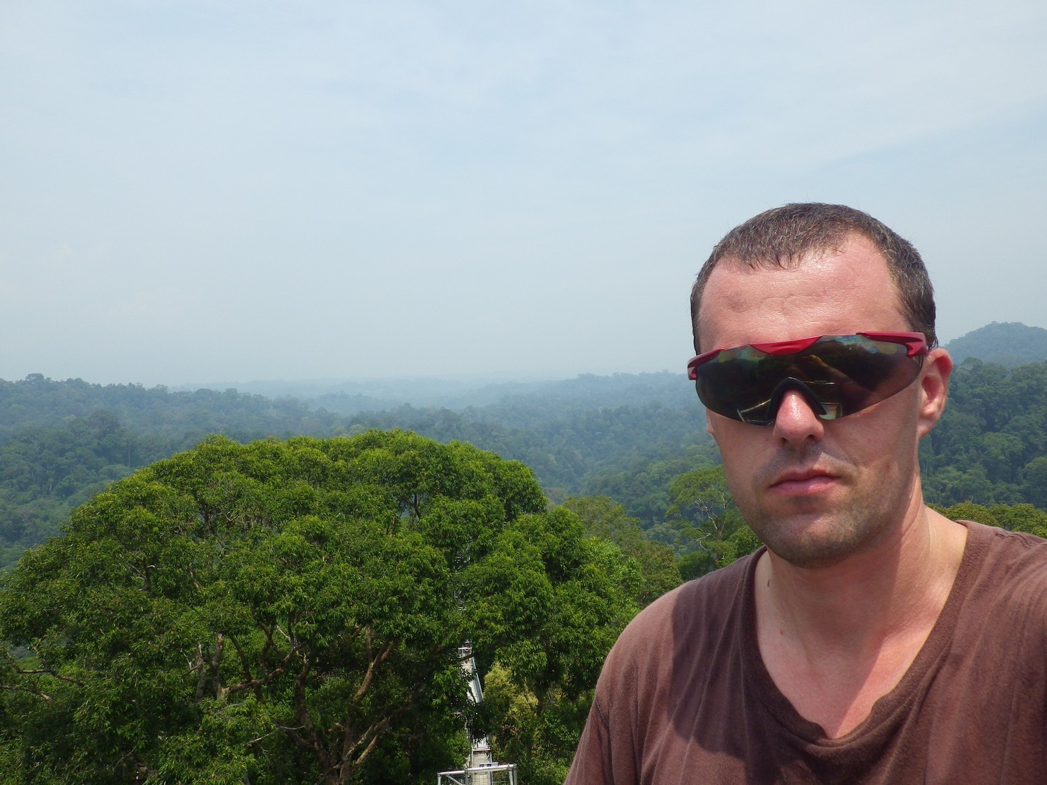 V sobotu 29. 9. 2012 ráno po snídani nás o půl osmé vyzvedli z hotelu Terrace v Bandar Seri Begawan a jeli jsme k řece Brunej. Tady jsme nastoupili na vodní autobus. Nejdřív krátce přes Brunejský záliv, pak na jih po řece Temburong na konečnou do Bangaru. Tady už na nás čekal Násir. Náš průvodce deštným pralesem. Nejdřív lehké občerstvení - místní specialita, jakési placky a potom 17 km autem na jih. Míjíme asi dvě vesnice. Dvakrát vidíme i long house. Dlouhá budova s velkou společnou místností, kde žije několik rodin dohromady. Tradiční způsob bydlení. V poslední vesnici, potom je už jen prales, Násir bydlí. Ukazuje nám tady vlevo je můj dům, vpravo nahoře bydlí rodiče a kousek před nimi má dům moje sestra. Silnice ještě kousek pokračuje. Zastavujeme u řeky. V té části řeky, kterou jsme objeli autem, žijí krokodýli. Tady už ne, je to tu mělký. Nasedáme na long boat. Úzká asi 5m dlouhá dřevěná loď vzadu se zavěšeným motorem. Místy je dost mělko. Vzadu jeden obsluhuje motor a vpředu Násir mu hlásí kudy je nejlepší cesta a občas bidlem se odrazí ode dna a loď usměrní. Přijíždíme do Selamat Datang. Tady probíhá registrace a platí se tu poplatek za vstup do Ulu Temburong national parku. Nasedáme do lodi a krátce za zatáčkou vystupujeme. Čeká nás 385m dlouhý trek na vrchol kopce. Tady stojí 40m vysoká ocelová konstrukce se 6 věžemi - canopy walkway. Rázem se dostáváme nad koruny okolních stromů. Pěkný výhled na široké okolí. Vracíme se k řece a long boatem jedeme zpět. Kousek za Selamat Datang zastavujeme. Krátkým pochodem potokem, který vtéká do řeky, přicházíme k menšímu vodopádu. Jakmile vstoupím naboso do jezírka pod vodopádem, malé rybky mi začnou okusovat nohy. Zpočátku je to nepříjemné, lechtá to, ale nakonec velmi příjemný pocit a relax. Nasedáme do lodi. Po asi půlhodinové jízdě zastavujeme u Násirovy chaty. Stojí na vnitřní straně levotočivé zatáčky kousek od řeky. Tady poobědváme. Má tu několik duší z auta. Půjčujeme si každý jednu. V této části řeky je klidná vody. Sedáme do duší a volně plaveme po hladině. Všude okolo jen řeka a prales. Ruší nás jen několik projíždějících long boatů s turisty. Násir říkal, že když je dost vody, nasedne na duši a nechá se unášet řekou až do své vesnice. Nám tahle cesta na long boatu s pomocí motoru trvá cca půl hodiny. Přesedáme do auta. Míjíme benzínku Shell. Cena v přepočtu nafta za 5,20 Kč, benzín 8,75 Kč za litr. Když jsem Násirovi říkal kolik stojí v Česku, dost se tomu divil. Po příjezdu do Bangaru se vodní bus chystal k odjezdu. Měli jsme štěstí . Krátce před příjezdem do Bandar Seri Begawan začalo silně pršet. Pršelo tak silně, že jsme museli zpomalit. Já jsem přes čelní sklo téměř nic neviděl. Lilo i po vystoupení z lodi. Marně jsme čekali na domluvený odvoz do hotelu. Dešť neustával. V 16h máme vyklidit pokoj v hotelu. Jdeme pěšky. Do hotelu přicházíme zmoklí asi 15 minut po 16 hodině. Naštěstí to nevadilo.
