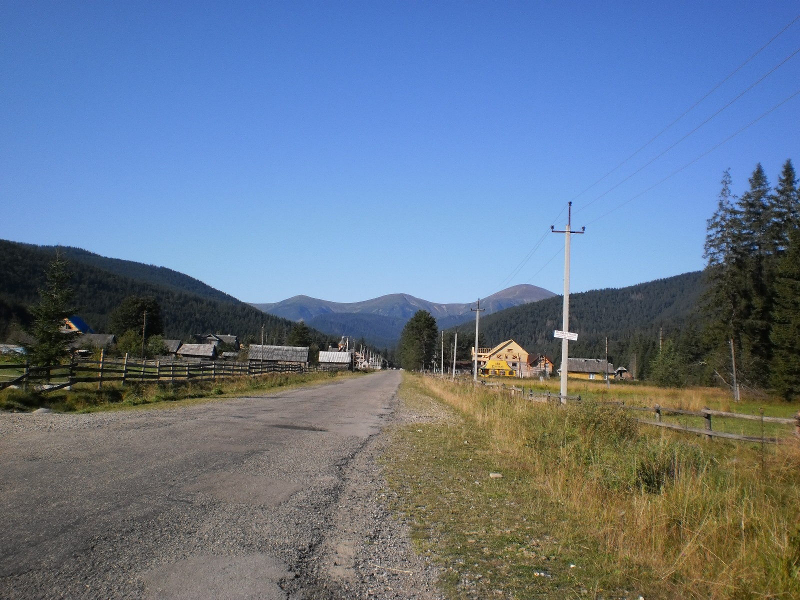 Potkáváme osamělá stavení. Probíhá senoseč. Asfalt příjemně ubíhá pod nohama. A horu máme pořád před sebou. Teď jsou to sice tři vrcholky, my však bezpečně víme, že nám je třeba nejvyššího, Hoverly. Mýtná brána nás silně favorisuje před osamělými vozy. Za putující po vlastních se neplatí. Ani teď ještě necítíme velké stoupání. Ano, sice jsme nocovali relativně vysoko, leč jdeme přeci na střechu Ukrajiny.