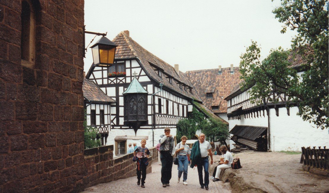 Vyrážíme tedy přes Plzeň nejprve ke svým známým jižně od Erfurtu.“Východní“ Němci už v té rané době pěkně poskočili v úrovni. Po skvělé hostině se pilo a povídalo do noci. Ráno se přesouváme do tehdy obecně známého města Eisenach, rodiště Wartburgů. Zde si prohlížíme zbytek historického jádra s pěknými typickými hrázděnými domy pod hradem Wartburgem z 11.stol. Tento docela pěkný hrad si později, od r.1999, zasloužil zápis do chráněných památek UNESCO. Ve městě je zajímavostí ještě Úzký dům, široký pouhé 2m s výškou 6m a pozoruhodná dvojice kostela sv.Michala s vedlejší věžovou Mikulášskou bránou. V bývalé NDR už jsme předtím byli několikrát, ale nikdy v Eisenachu. Předpokládám, že dnes už tam zabloudí jen málo našinců.