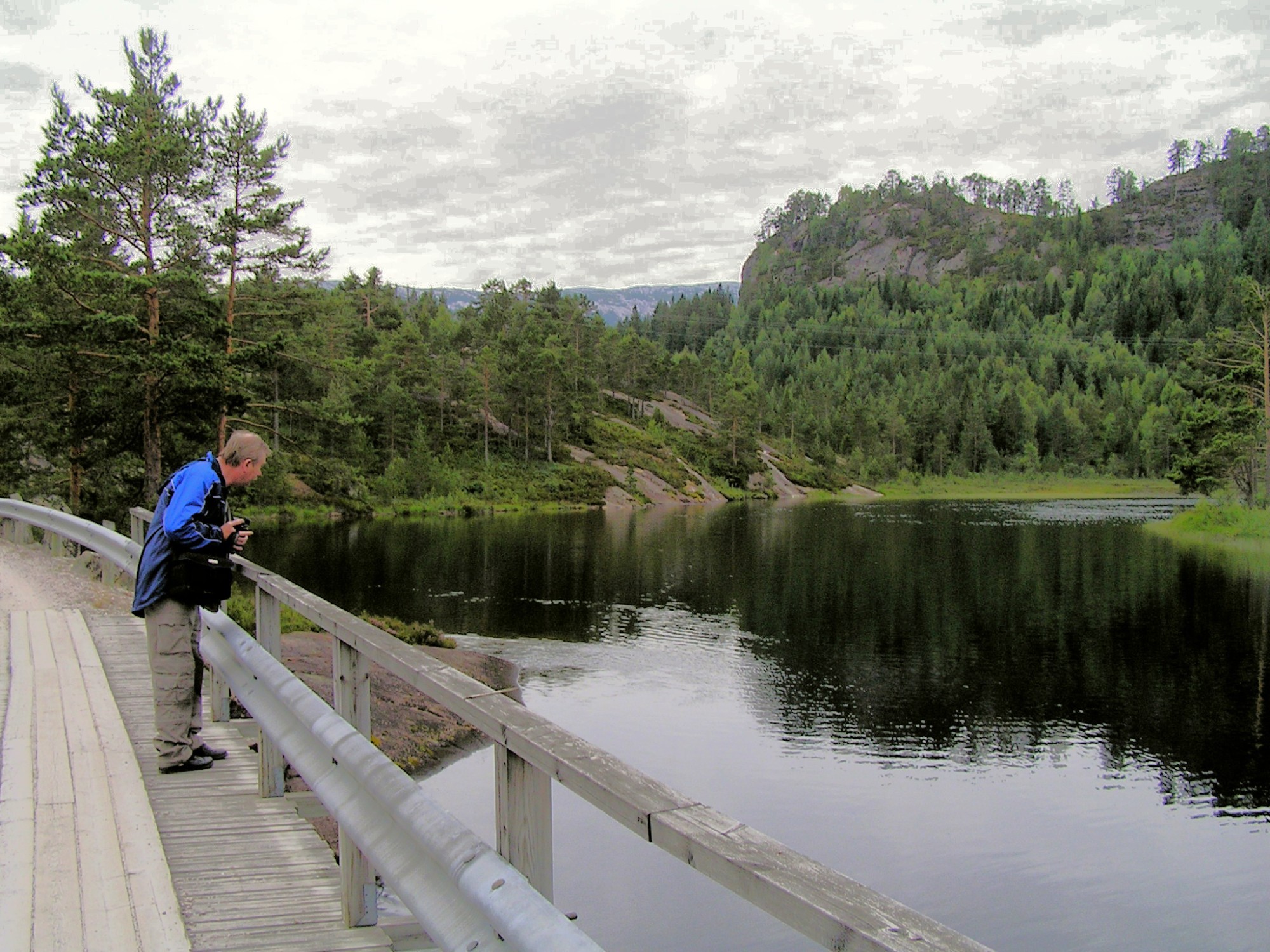 Krajina ubíhá kolem okének auta, povídáme a uvědomujeme si, že i na samotném jihu Norska je velmi krásná příroda. Stačí se jen odpoutat od průmyslového zalidněného pobřeží. Dá se o tom přesvědčit kdekoliv, my to právě děláme poblíž obce Killegrand. V turistickém průvodci jsem si našla nenáročnou trasu přírodou v okolí této vesnice. Trasa má začínat u školy ve vsi, má obejít horu dokola obklíčenou jezery a řekou. Docela brzo jsme ten „začátek u školy" našli a jde se. Přecházíme lávku přes říční proud a zvědavě nahlížíme přes zábradlí. Voda je dost hluboká a až strašidelně tmavá. Žádné ryby vidět nejsou. Pokračujeme. po břehu jezera a slyšíme, co už zase dlouho neuslyšíme: Nic. Vůbec nic - hluboké, hluboké ticho. Vysvitlo slunce, je parno. Vzduch je nehybný, nešumí v korunách, nekýve trávou. I ptáci jsou z toho vedle, není slyšet ani píp.