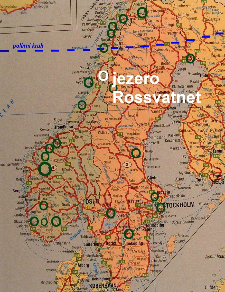 Jedeme klikatou šotolinou lemující břeh jezera Rossvatnet. Jezero je na naše poměry obrovské. Cesta nám připadá nekonečná, dá se jet maximálně čtyřicítkou. Ujeli jsme už 60 km a pořád nic. Jezero je téměř bez civilizace, jen tu a tam je nějaká samota. Už je skoro tma, břehy jsou skalnaté a tak z nouze zastavujeme na kamenité ploše asi sedm metrů nad hladinou.