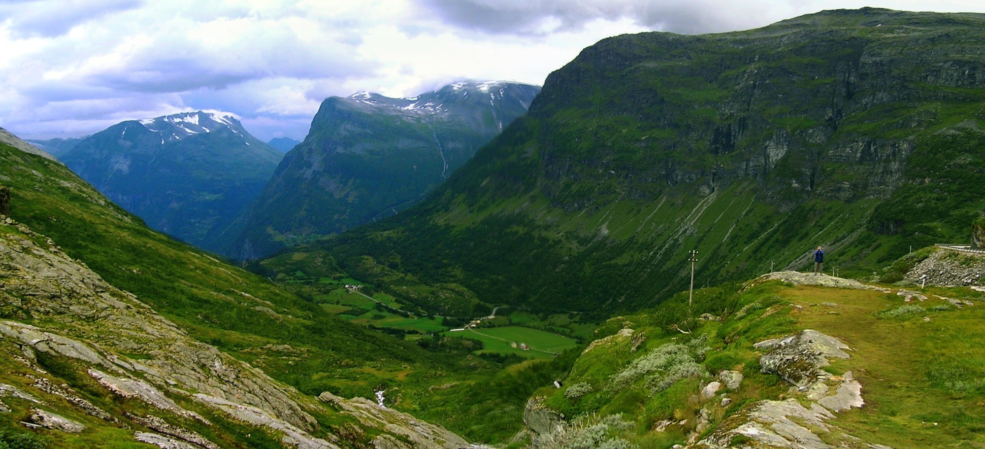 Z druhé strany hory, odkud jsme přijeli, je hluboké údolí. Dole pod mraky je docela daleko vidět. V dálce mezi horami se půl druhého kilometru pod námi modrá voda Geirangerfjordu. Přímo pod „nohama" se nám klikatí had silnice. Krajina s mraky a sluncem hraje drama. Je to úžasný pohled.