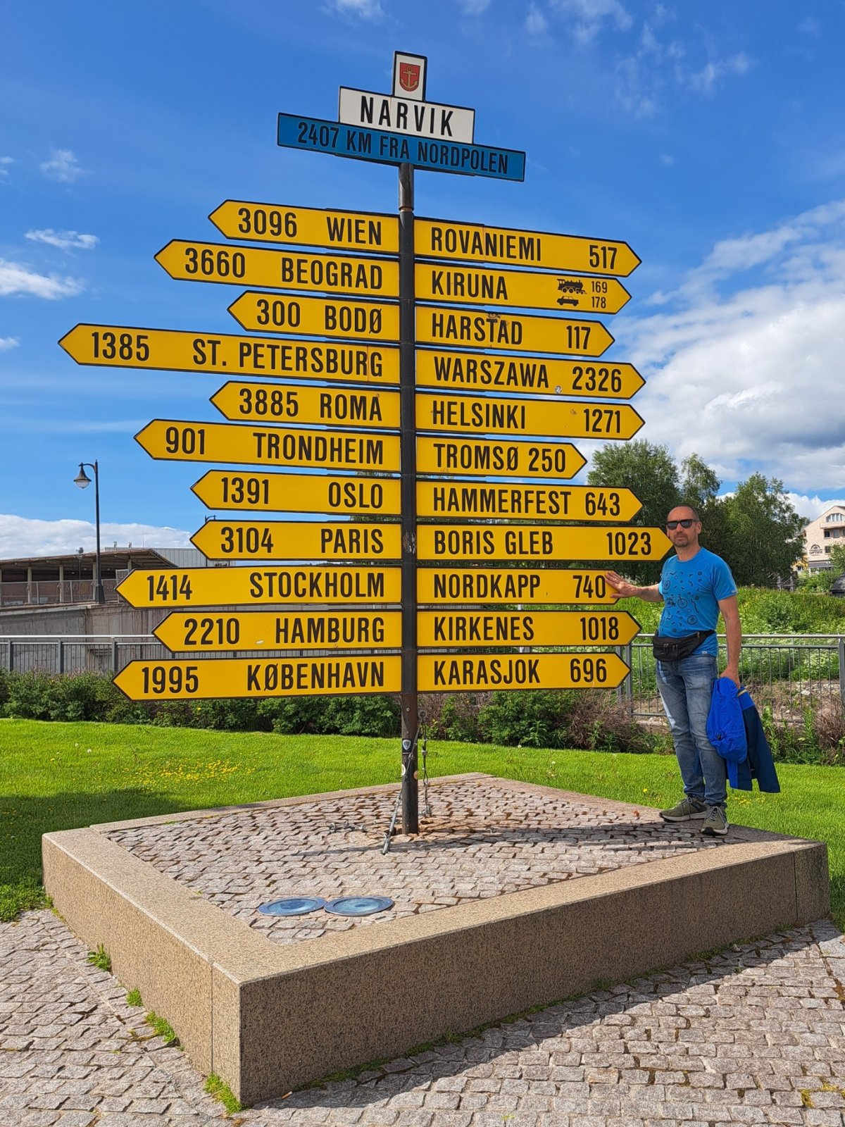 Turistický rozcestník na Tržním náměstí s 23 údaji o vzdálenostech z Narviku na některá zajímavá a známá místa.  autor: Bubinga