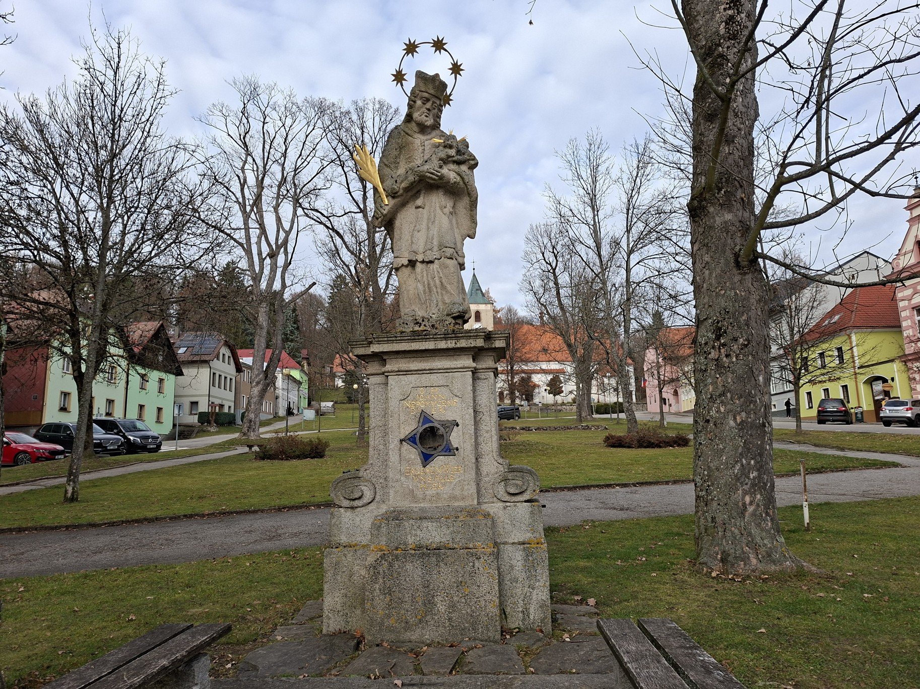 Jan Nepomucký pozoruje dění v Horní Plané z hlavního náměstí, odkud má velice blízko do příjemné kavárny Café Kočky.  autor: Bubinga