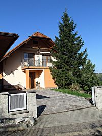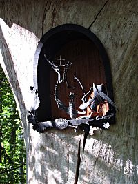 Dnes jsem si ji mohl prohlédnout jen z okna autobusu, protože jsem vystupoval až na další zastávce u školy. K odbočce k ní bylo nutno se po hlavní silnici kousek vrátit. Objekt ZŠ a sousední MŠ jsou umístěny nad říčkou v docela prudkém svahu kopce a okolo nich jsem svižně vystoupal na nejhořejší konec ulice s hezkými rodinnými domy. Fasádu jednoho zdobila kresba ještěrky. Další už mírnější stoupání vedlo nad chatovou osadou mezi okolními lukami úvozem s polní cestou se svatým obrázkem, která se o něco výš po vběhnutí do hvozdu stala pro změnu cestou lesní. A ta mne po 500 metrech chůze přivedla k rozcestí na plošším hřebeni a velmi pěknému zátiší se zajímavě pojatou výklenkovou lesní kaplí zasvěcenou sv.Hubertovi.