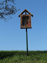 Odtud jsem po cyklostezce 5055 procházející lesní zpevněnou cestou zamířil pod temenem vrchu Losky (377 m) k nedaleké silnici z Bohuslavic u Zlína do Doubrav. Cyklostezka ji proťala a na druhé straně pokračovala dál po hřebeni po lesní asfaltce. Z ní jsem o hodný kus dál lesní cestou odbočil k lučině s nějakým obydlím, poblíž něj se měla na okraji lesa nacházet kamenná výklenková kaplička. Ta tam sice stála, ale na pastvině pobíhal volně puštěný vlčák, takže foto sakrální stvabičky jen ze zadní strany... a raději honem pryč!