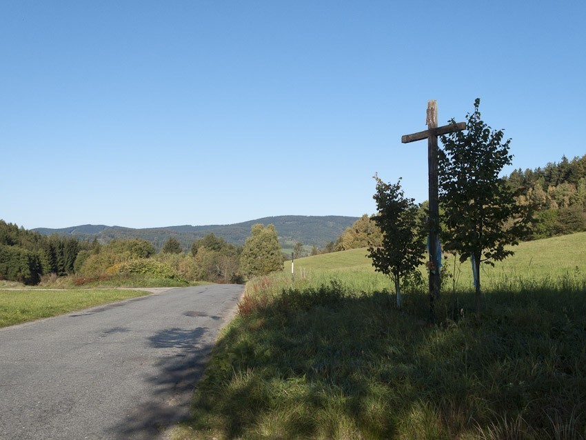 Kupodivu Stary Gieraltów i celé okolí vypadá lépe než končiny pod Kladským sedlem, asi většina turistických aktivit dříve bývala tady, nakonec údolí je daleko širší, takže je i více možností k hospodaření. Nowy Gieraltów je konečnou osadou cesty přes Polsko, u kostela s poněkud panoptikálním okolím odbočujeme ke státní hranici. Poláci tu mají na hřeben celkem novou asfaltku, sice prudce kolmo na vrstevnice, ale s dobrým povrchem. Ta bohužel na hranici končí, ale konečně uvidíme Hraničky. Slyšel jsem na ně samou chválu. Ono tu vlastně kromě jedné chalupy a jedné ruiny snad nic není, cesta vede přes louku, ale fakt tu krásně je. Po bývalé vesnici kromě dvou zmiňovaných objektů nic nezbylo, ale rozsáhlá louka, dnes navíc pokrytá spoustou kulatých balíků sena vypadá opravdu malebně, u přechodu najdeme i zajímavé skulptury. U jediné osídlené chalupy se osvěžíme ve studánce a vyrážíme modrou cykloznačkou 6044. Ta se vlastně v úbočích klikatí skoro pod celým hřebenem Rychlebských hor (Od Javorníka, nad Račím údolím, až pod Smrk k Horní Lipové) a je vlastně takovou magistrálou Rychlebek. Občas mírně stoupá a zase stoupá, ale udržuje si slušnou výšku. Tak uvidíme, kam až po ní dojedeme. Cesta obkrouží Borůvkový vrch pak Špičák, Nad Petrovicemi dokonce nějakou dobu pokračuje jako asfaltka, bohužel jak asfalt končí (někde pod Břidličným vrchem), je na cestě nasypán nový makadam, který pohyb na kole značně znesnadňuje, průměrná rychlost klesá na nějakých 7-8km/hod, což je dosti málo, přece jen už je kratší den a chtěli bychom dojet do civilizace za světla. U pramene Peklo tedy usoudíme, že jízda na šutrech připomíná ďábelské radovánky, takže na rozcestí Pod Kovadlinou se dlouho nerozpakujeme a odbočkou bílé trasy zamíříme do Stříbrného údolí. Vzápětí i makadam končí, tak sjezd je už veselou záležitostí, navíc dole už je asfaltka. Samozřejmě uděláme povinnou zastávku u vodopádů Stříbrného potoka (neboli Nýznerovských), nevím jak ostatní, ale já jsem tu asi po deseti letech. V Nýznerově na druhý pokus nacházím zkratku do Vápenné, ať nemusíme přes Žulovou. Už je kolem půl šesté, tak nakonec rozhodneme že to tu zabalíme. Vlak by měl jet za necelou hodinu, hospoda u Drescherů je nedaleko nádraží, tak není co řešit. Přestupujeme v Lipové, mají tu naštěstí otevřenou nádražku, protože domů jedeme courákem, čili je kde nakoupit proviant na skoro dvouhodinovou cestu. Myslím že nějakých 88km v kopcích nakonec nebylo tak špatných.