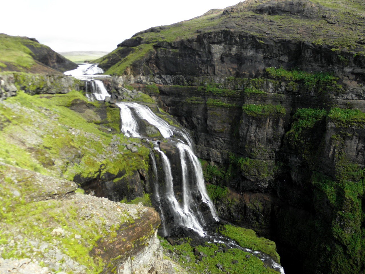 V první půlce července L.P.2014 realizujeme ve dvojici jeden jubilejní dárek. Přes Berlín a zdejší rozpaky se o půlnoci ocitáme v deštivém a větrném Keflavíku (A). Hned realizujeme zapůjčení auta (Hyundai i30, carrental.is) a pak nás čeká kratší přejezd do Hafnafjörduru s vcelku útulným noclehem. Po ranní snídani za deště míříme na sever. Opouštíme Reykjavík, lije jak z konve, tak pádíme poněkud bezcílně, kocháme se prvními fjordy. Najednou se vyčasí a poblíž zrovna údajně nejvyšší vodopád Glymur. Neplánovaně vyrazíme na první párhodinový výlet. Cestiček je několik, jaksi mineme nenápadnou značku a šplháme nahoru méně obvyklou cesto vlevo, kolem říčky a stále hlubší zemské průrvy, místy blátivou stezkou skrz břízovitými keříky. Vystoupáme nahoru, kde nás čeká úchvatný pohled, dna nedohlédnouc, za námi fjord. Počasí se, jak zde nutno stále počítat, opět promění, deštík však naštěstí nijak vydatný.