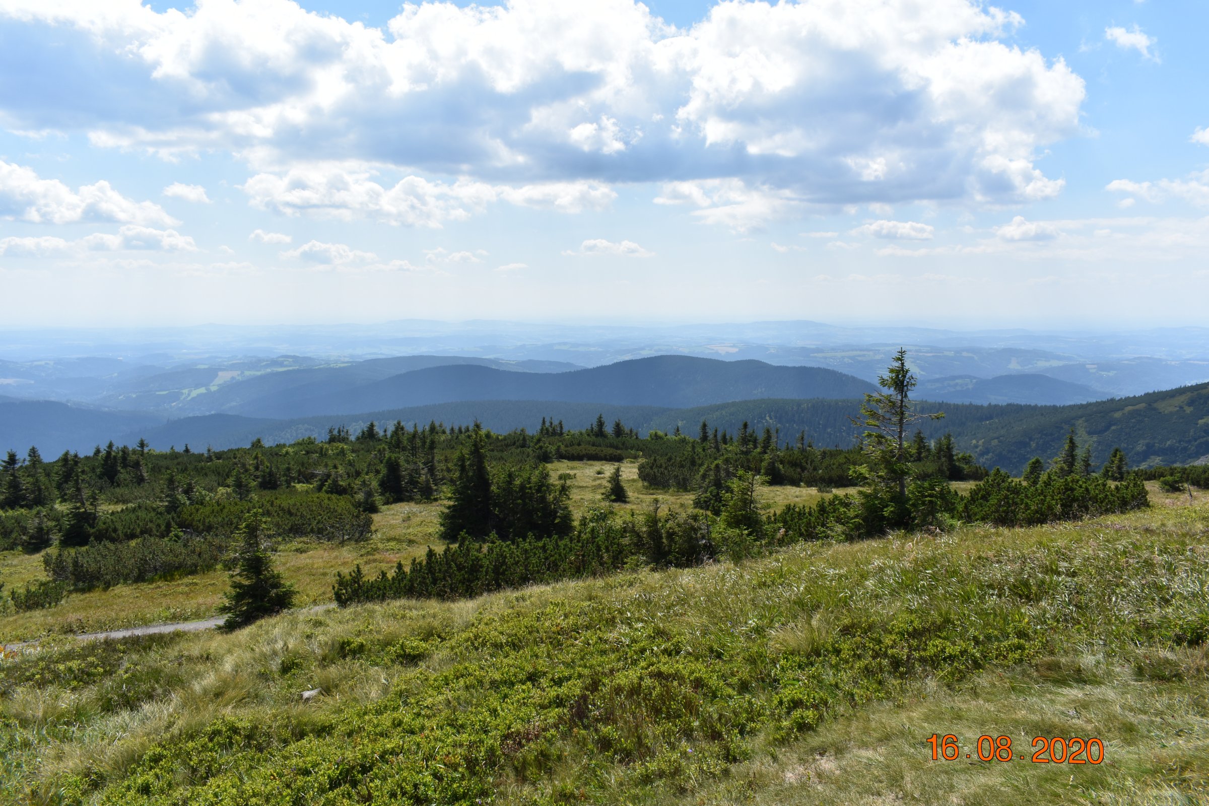 První den dovolené se jedeme seznámit s Krkonošemi. Jedeme autem ze Špindlu, kde jsme ubytováni v Hotelu Aquapark, směrem na Horní Mísečky. Část cesty tedy absolvujeme po Masarykově horské silnici, která vede až na Zlaté návrší k Vrbatově boudě. Až nahoru ovšem auta nesmí. Zaparkujeme (120 Kč) na Horních Mísečkách, což je nejvýše položená horská osada v Krkonoších. Dále jdeme kus pěšky na autobusovou zastávku Vítkovice-Horní Mísečky, odkud v letní sezoně jezdí kyvadlová doprava (jízda 50 Kč).