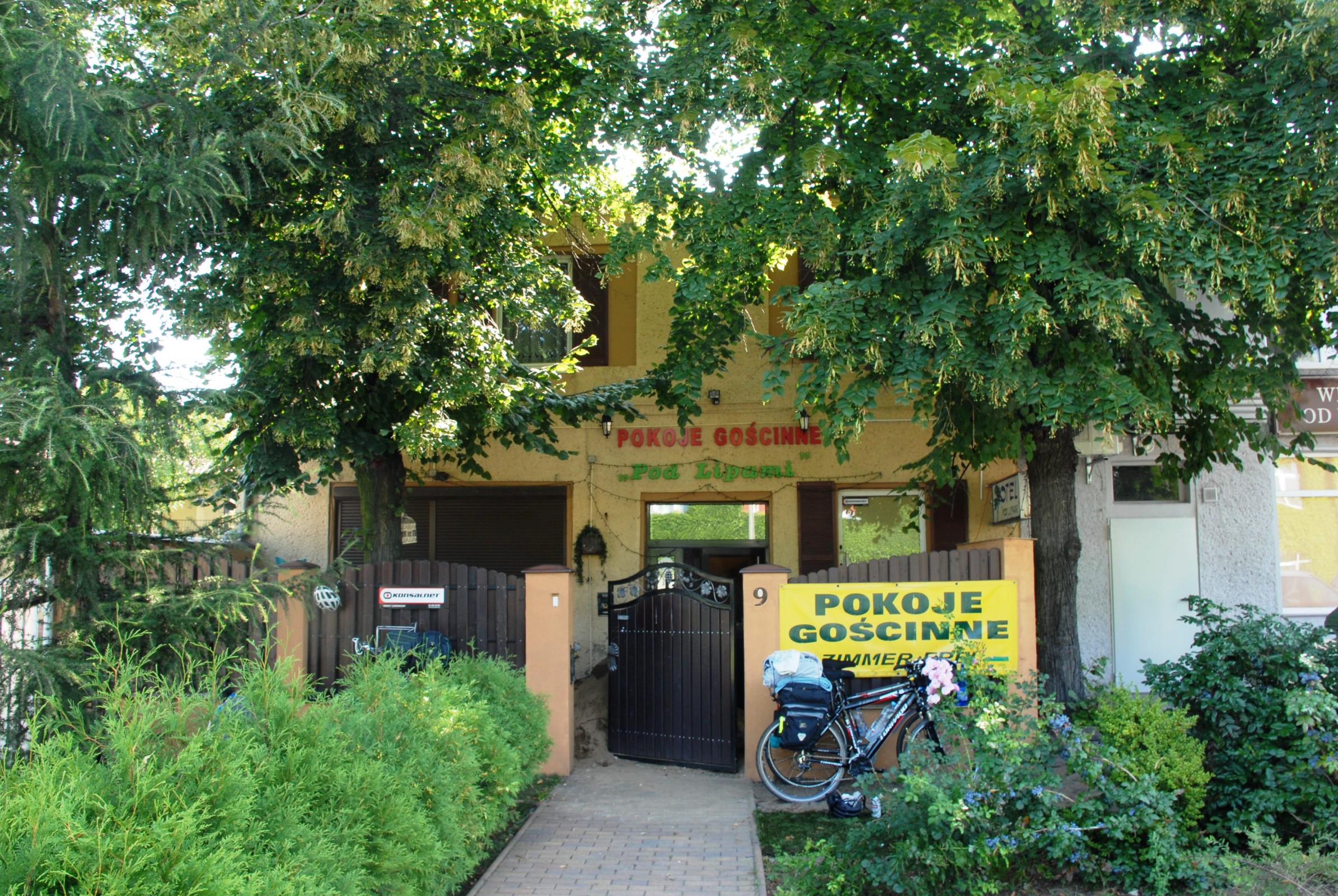 Ranní snesení kol křivolakým schodištěm nebylo vůbec snazší, než včerejší transport vzhůru, ale zvládli jsme to bez úrazu. Při snídani na dvorku u hromady písku, jsme teprve viděli, jak penzion vypadá zvenčí (obr. 01). Po snídani jsme vyjeli na nejkratší etapu celého putování, do městečka Lubrza. Od penzionu jsme jeli k nádraží (dworzec kolejowy), přičemž jsme znovu vysoce ocenili, že na chodnících bývá vyznačen pruh pro cyklisty, a kde není, tam ohleduplná jízda po chodníku nikoho nepobuřuje. Jízda ve vozovce by v městském provozu byla nejspíš krvavou lázní.