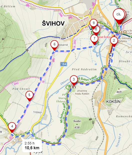 Dnes jsme po ní došli ke zřícenině hradu Kokšín. Hrad byl postaven na kopci nad řekou Úhlavou. Přesný datum jeho založení znám není, podle archeologických nálezů se předpokládá, že se zde žilo již v 15. století, tedy o něco dříve než na hradě Švihov. Později se stal součástí obranného systému hradu Švihova. Byla zde předsunutá hláska, odtud se hlídala stavidla, jimiž bylo možné zatopit přilehlé louky. Po krátkém strmém výstupu jsou stále ještě vidět kamenné základy mohutné věže nebo paláce. Z vrcholu je hezký výhled.