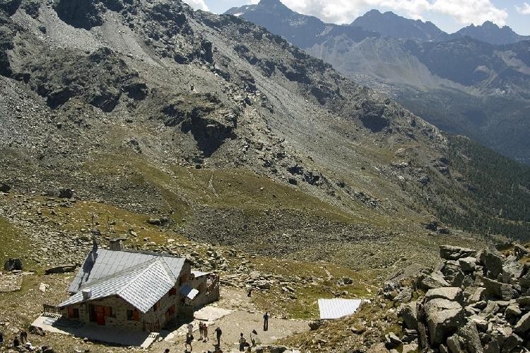 Rozhodnutí pro tento vrchol padlo potom, co se před námi v národním parku Ecrins ve Francii zřítila silnice a tím zablokovala přístup k dalším vrcholům, jež jsme měli v plánu. Netrvalo dlouho a už jsme se přesunovali do Itálie do doliny Valmalenco. Výjezd dolinou Valmalenco ( větev údolí Valltelina ) je samo o sobě zážitkem, na který se jen tak nezapomíná. Město Sondrio leží v nadmořské výšce 298 m.n.m. a cílový bod silnice na Campomoro je v 1934 m.n.m. Nespočet serpentin, desítky tunelů vystřílených ve skále a ve finále dvě krásné přehradní nádrže na konci silnice v nás zanechaly příjemné dojmy. Od přehradního jezera Lago Campomoro se vydáváme po stezce č. 5 ( Via Alpina ). Nejprve velmi strmě překonáváme po kvalitně upraveném chodníku skalní ostruhu a dlouhým traversem míjíme stavení Alp Musella ležící asi 120 metrů pod naší cestou. Pokračujeme suťovou kotlinou směrem k chatě Rif. Carate Brianza. Tomuto úseku cesty se nazývá pro svou úmornost Sedm vzdechů. Asi po 2 hodinách od parkoviště docházíme, předbíhajíce dav asi 20 lidí před námi, k chatě Rif. Carate Brianza ( 2662 m.n.m. ). V chatě a hlavně v jejím blízkém okolí je to jako v mraveništi. Snad stovka lidí se opaluje, konverzuje a pokukuje. Zde také 80% turistů končí. Potkáme zde rodiny s dětmi, babičky v keckách apod. Nad chatou dosahujeme sedla Bocchetta di Forbici odkud se otevře překrásný pohled do jižních stěn Piz Bernina, Piz Roseg ( čti Roseč ) a na rozlehlý ledovec Vedretta di Scerscen ( čti šeršen). Cesta pokračuje lehkým sestupem v kamenném poli (dobře značeno) až do rovné pánve pod skalní stěnu na které již vidíme asi 160 metrů nad námi chatu Marinelli. Je zde také jezírko, ale o nabrání vody ( kalná ) si necháváme jen zdát. Jdeme tedy prudkým stoupáním na chatu. Po asi 20 minutách již popíjíme pivko na chatě Rif. Marinelli Bombardieri ( 2813 m.n.m. ). Chata má velkou kapacitu a bez problémů schramstne všechny zdejší návštěvníky. Voda teče pár minut nad chatou ( uvnitř je nepitná z ledovce ). Ubytování v legeru nás stálo 12 EUR/osoba ( Alpenverein ), pivo 4 EURO. Velmi milá a hezká obsluha vše bohatě vynahrazovala. Kolem chaty by se těžko hledalo místo pro stan, leda na travnaté terase přímo pod okny ( to by ale byla komedie ). Spaní je zde tedy více než vhodné. Na druhý den v 6 hod. ráno vycházíme po širší cestě až ke skalnatému prahu. Ten překonáváme lehce podél tekoucího potůčku a vycházíme tak nad ledovec Scerscen v sedle Passo Marinelli occidentale. K ledovci musíme opět sestoupit asi 60 metrů. Ledovec Vedretta di Scerscen Superiore je zde poměrně mírný, avšak krutě rozbrázděný trhlinami. My jsme na něm neměli žádný sníh, a tak byl dobře čitelný. I tak jsme se ale neubránili nutnosti mnoho trhlin přeskakovat. Některé dokonce s velikým rozběhem :-)) Po vymotání z bludiště ( není až tak hrozné, doporučuji jít horním okrajem ) přicházíme ke stoupání. Několika serpentinami ve výšce asi 3300 m překonáváme střední část ledovce. Zde je velké nebezpečí pádu do trhliny, protože se zde celoročně drží slabá vrstva sněhu. Také se nám to jednou povedlo a to celkem nečekaně až po pás. Kameny v tomto úseku jenom sviští, takže rychle pryč. Překonáme malý skalní výšvih a dostáváme se tak na horní patro ledovce. Úvod je velmi strmý, uklouzaný od nahrnutého štěrku ( místy jemně zasutěný ) a velmi ohrožený padajícími kameny. Zde doporučuji se zajistit. Místo přechodu do bezpečí bylo asi 10 - 12 metrů široké a velmi prudké, takže jsme ho raději odjistili. Uklouznutí by mělo za následek sjezd minimálně 250 metrů neznámo kam. Po stoupání rozbředlým sněhem dojdeme ke skále, z níž zrovna slaňuje družstvo 5 horolezců. Nástup na zajištěnou cestu ( pozor hned tak nějaká Via ferrata se jí nevyrovná ) je místy převislý, stupačky kramlí jsou velmi daleko od sebe ( je tu spuštěno i fixní lano zn. Beal :-)) ). Tento úsek při nejistotě také doporučuji odjistit ( nazpět 100% slanit, slézaní bez jištění je v tomto místě téměř nesmyslné ). Po kuriózním vyhýbání a vzájemné pomoci se slaňujícím družstvem jsme se dozvěděli, že je toto nejtěžší úsek vedoucí na chatu, a že oni na vrchol Berniny nevylezli. To nás rozhodně na nohy nepostavilo a za přicházející mlhy a celkové velké vlhkosti vzduchu docházíme pořád velmi namáhavě za pomoci jištění řetězy, kramlemi a kolíky k chatě Marco e Rosa ( 3609 m.n.m. ). Chata je zcela nově přestavěna do supermoderní základny zvenčí obložené solárními kolektory. Vnitřek jenom voněl novotou. Byli jsme tam však zcela sami. Jen dva chataři dělali nenucenou společnost. Zřejmě špatné počasí nikoho na vrchol nelákalo. Ubytování zde stojí 12 EUR/noc ( Alpenverein ). Čaj stál 1,50 EUR. Po asi půlhodině odpočinku vyrážíme za husté mlhy po stopách směrem k Bernině. Ty nás vedou pouze prvních 200 výškových metrů sněhem. Poté jsme dorazili k nástupu na skálu. Zde nebylo žádné značení, ale postup byl čitelný. Stále v mačkách překonáváme několik desítek metrů skalního úseku ( I-II.UIAA ) a po krátkém komínu se dostáváme k šikmé desce ( 6 metrů, II.UIAA ), kde Láďu raději jistím ( umístěné dva nýty ). Potom krátký sněhový hřebínek a dostáváme se tak ke klíčovému místu výstupu. Tím je asi 50 metrová skalní stěna. Dva nýty jsou vidět, dál ne. Mlha snad ještě zhoustla. Všude jen ticho a do toho vítr, který zesiluje svou intenzitu s přibývající výškou. Nalézám na mokrou skálu raději v mačkách a tahám lano přes dva nýty. Další je za menším bubnem, který poměrně obtížně přelézám. Zde dobírám Láďu. P