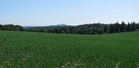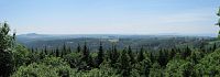 Na západní straně je vidět cesta, po které se téměř po rovině vydáme na vlastní vrchol Homole (681 m), kde je vyhlídka západním směrem a přístřešek - konečně si mohu na chvíli sednout. Panoramatická tabule tu není, ale Ota to prý pozná. Je vidět Dyleň s částí Českého lesa, část Mariánských Lázní i Slavkovského lesa a také plocha autodromu, okolo které jsme sem šli.