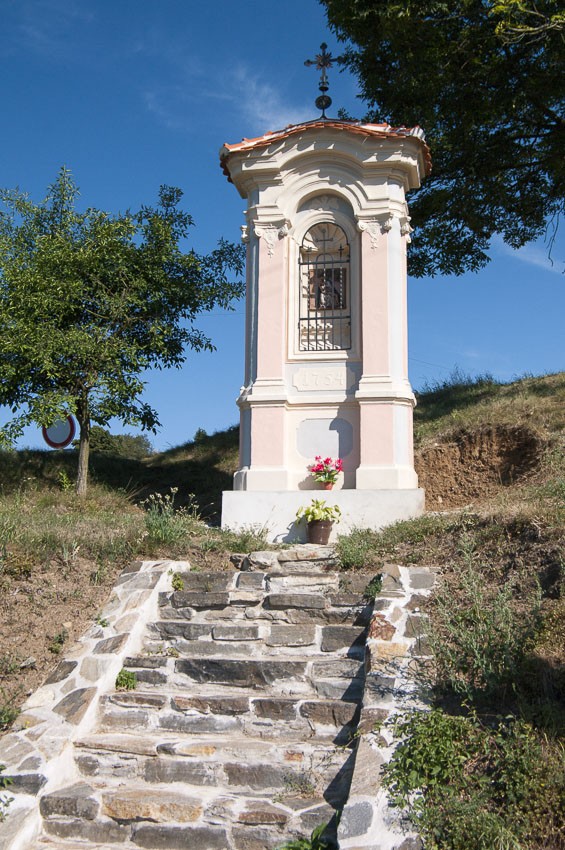 Na dnešek předpověď ještě slibuje dosti parno, když už jsme na Vranově, musíme samozřejmě někam k přehradě, a protože na opačném, tedy horním konci nádrže jsou dva hrady (dál ještě jeden), celkem logicky vyrazíme sem. Tradičně musíme do kopce, sice počáteční stoupák není tak prudký jako na zámek, ale převýšení je celkem stejné, kolem Třídubové kapličky do Lančova. Chtěl jsem jen nakouknou do místního kostela a když jedu dál kýženou cestou, zezadu na mě hvízadají. To je tedy výkon, ještě nemáme ujeto víc než 5km a už sedí v hospodě. Nu což, připojím se k většině.