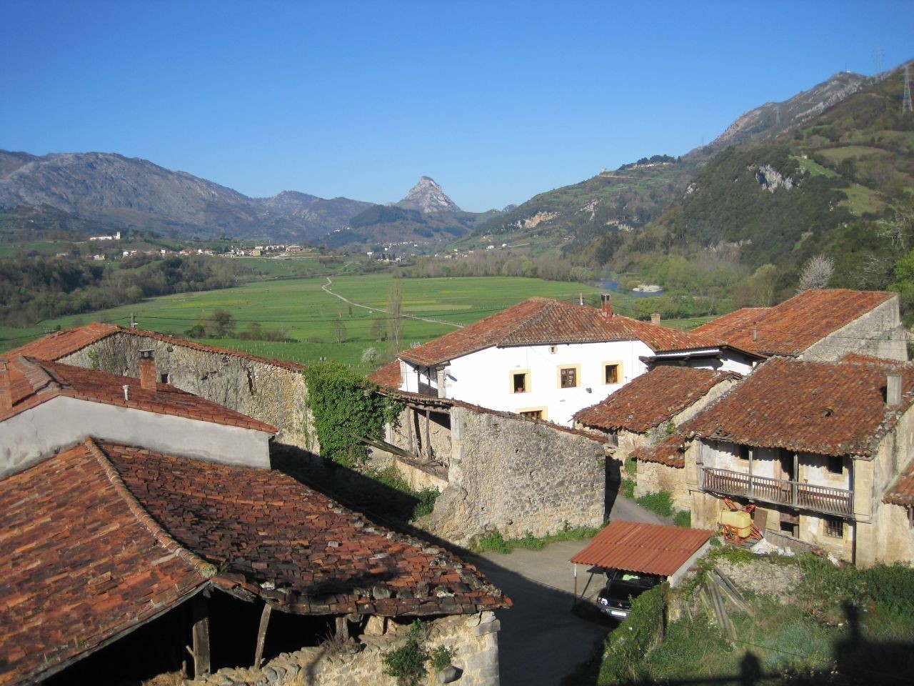 V okolí stojí několik domečků, které jsou na mapě označeny jako Majada del Hoyo del Tejo. Odhaduji však, že slouží spíše k hospodářskému účelu než k trvalému bydlení. Možné ale právě z nich přišli dva postarší domorodci, kteří odpočívají na louce nedaleko od nás. Vypadají spokojeně. Pohled na ně mi tak nějak vyjadřuje život ve Španělsku. Lidé nespěchají, nepřetrhnou se, každý má na všechno dost času. Nějaká efektivita, důslednost, na to se tady nehraje. Častá odpověď je „maňana“, tedy klídek, na všechno je čas zítra nebo pozítří. Zkouším se jich ptát na autobus. Nejprve to vypadá, že se dovídám dobrou zprávu, ale posléze zjišťuji, že jsem jim asi rozuměl špatně. Nic dneska už nejede. Patrně budeme muset pokračovat pěšky. Rozhodli jsme se však ještě chvíli stopovat. A volba to byla dobrá. V 18 hodin 15 minut nám zastavuje auto, které však bere pouze Frantu a batohy, posléze tam ještě přisedá Drahoš, jelikož já současně zastavuji další auto. Ve vysokohorském městečku Sotres (1.045 m.n.m.), nejvýše položené osadě v pohoří Picos de Europa, vystupuji a vidím, že autostop mých spolucestujících na mě čeká. Španělština Franty a Drahoše (stejně jako ostatní cizí jazyky) se opírá pouze o počítání do pěti (víc piv si většinou nedávají) a o několik dalších základních slovíček. Přesto se jim za jízdy podařilo domluvit, že mohu nastoupit do zavazadlového prostoru dodávky, na což původně nechtěl řidič slyšet. A tak pokračujeme dalších 11 kilometrů, do místa zvaného Puente Poncebos, které je výchozím místem řady turistických cest. Auto kličkuje po úzké asfaltce, proplétající se přes staré kamenné mosty a okolo zajímavých osad údolím říčky Duje.