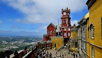 Arribas Sintra Hotel. Druhý den ráno je sice zataženo, ale na déšť to nevypadá. Nasedám na motorku a mířím ke Cabo da Roca. Byl jsem tu asi před dvěma roky, ale to nebylo na motorce! A na motorce je cestování úplně jiné. Natáčím maják, útesy, výhled na Atlantik je dechberoucí. Na kamenné desce stojí: „Zde, kde země končí a moře začíná.“ Vítr fučí, dron nemá ani cenu vytahovat. Musím se spokojit pouze se záběry ze země. Snad to bude na další zastávce lepší.Z Cascais přejížím do Sintry. Mám v plánu navštívit Palácio da Pena. Dříve jsem v Sintře navštívil „obrácené věže“ v Quinta da Regaleira a byl to neskutečný zážitek! Tentokrát vyrážím až na vrchol kopce. Klikatící se silnici lemuje několik značek zón zákazu vjezdu. Netuším, jestli se smí dál nebo ne. Auta nahoru jezdí, tak je následuji. Policista u brány o mě nejeví zájem, tak je snad vše ok. Zaparkuji na parkovišti asi 250 metrů od pokladen. Kupuji vstupenku za 10 Euro pro vstup do zahrad a nádvoří jedné z nejnavštěvovanějších památek Portugalska. Palác byl dokončen v roce 1854 a stal se symbolem romantismu 19. století. Je směsicí stylů, které dohromady tvoří až pohádkově působící celek. Fasáda je zářivě žlutá a červená, doplněná o typické portugalské azulejos – keramické dlaždice, které mají nejen dekorativní, ale i praktickou funkci.