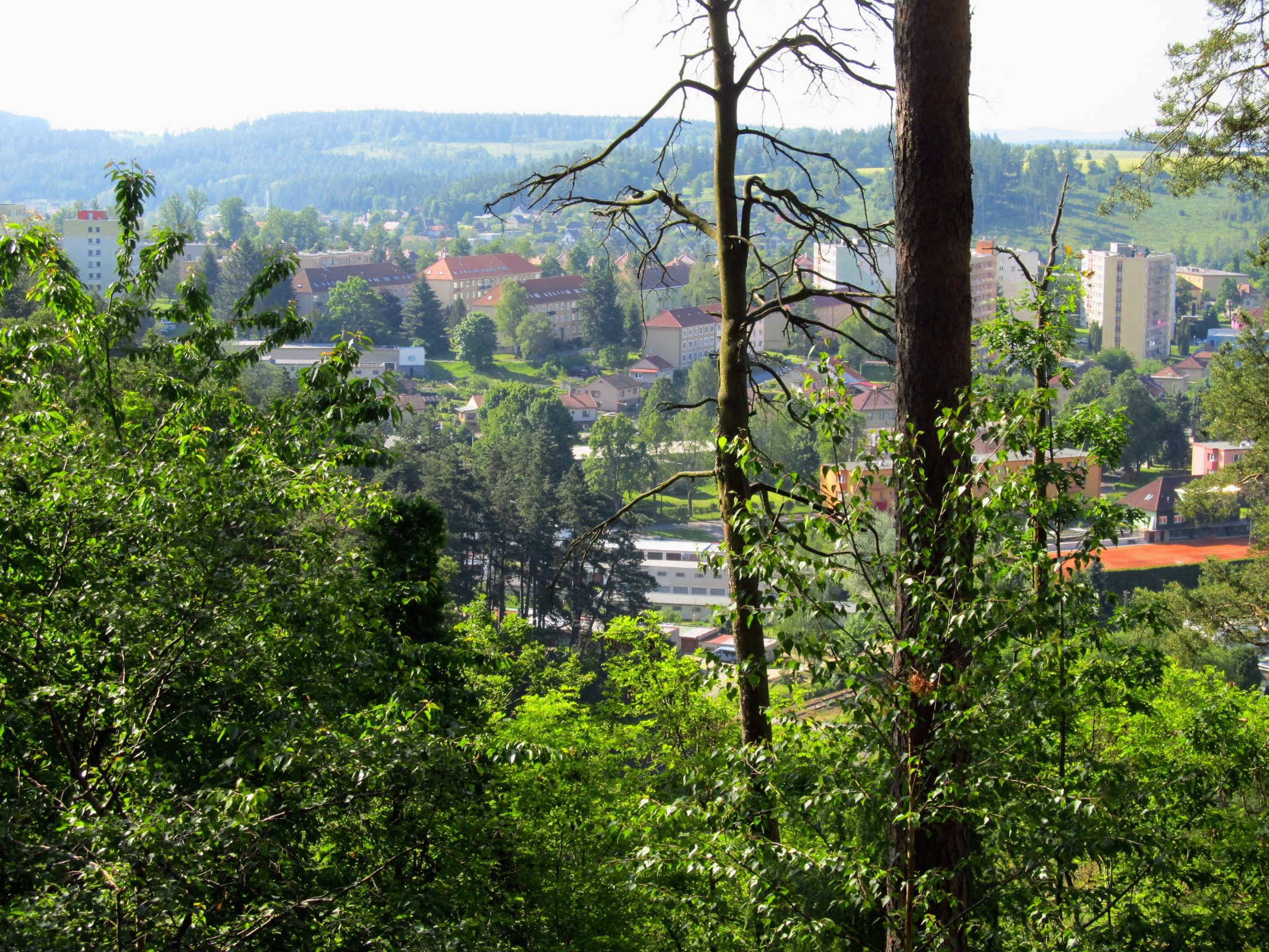 Hned za mostem přes potok Pardidub uhýbám za silnice vzhůru lesnatou strání znovu k silnici na Chabeřice. Hledám mezi stromy trochu přijatelný výhled zpět k městu s výsledkem nevalným. Vycházím na silnici a rovným úsekem cesty mezi poli a loukami kolem kapličky mezi dvěma mohutnými lípami přicházím do Chabeřic.