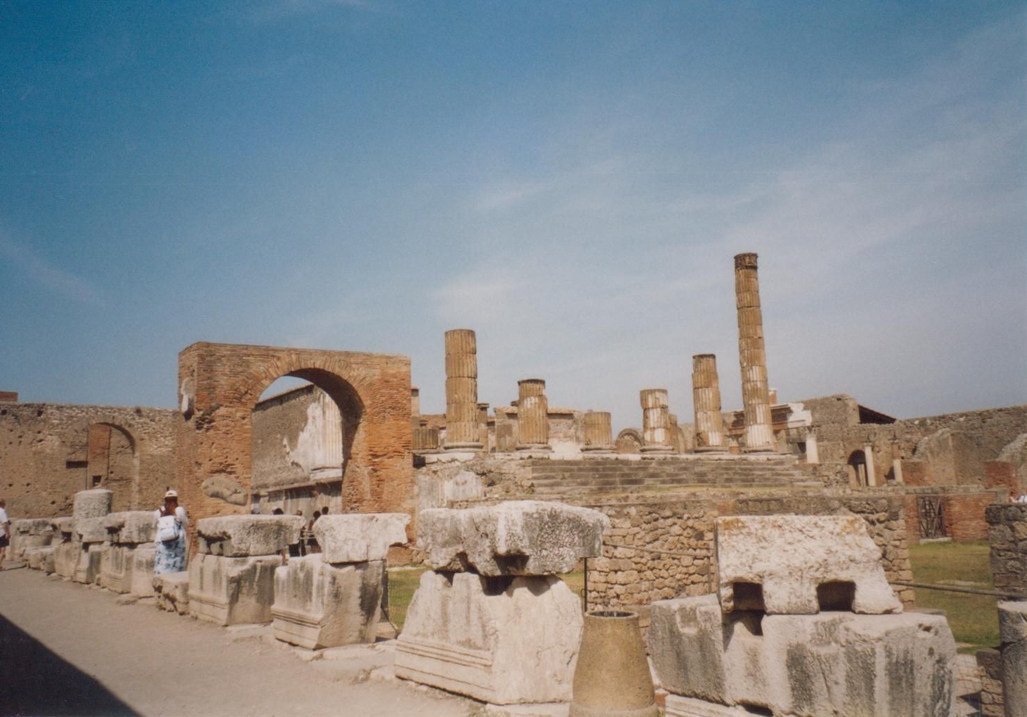 Poté jsme se vydali na prohlídku Pompejí. Vstoupili jsme impozantní starobylou bránou, Porta Marina. Napravo jsou zbytky Venušina chrámu a po Strada della Marina okolo Domu Romula a Rema a Apollova chrámu a jsme vstoupili na velkolepé prostranství Fóra. Fórum bylo centrem hospodářského, politického i společenského života v Pompejích. V pozadí jsme viděli Vesuv.