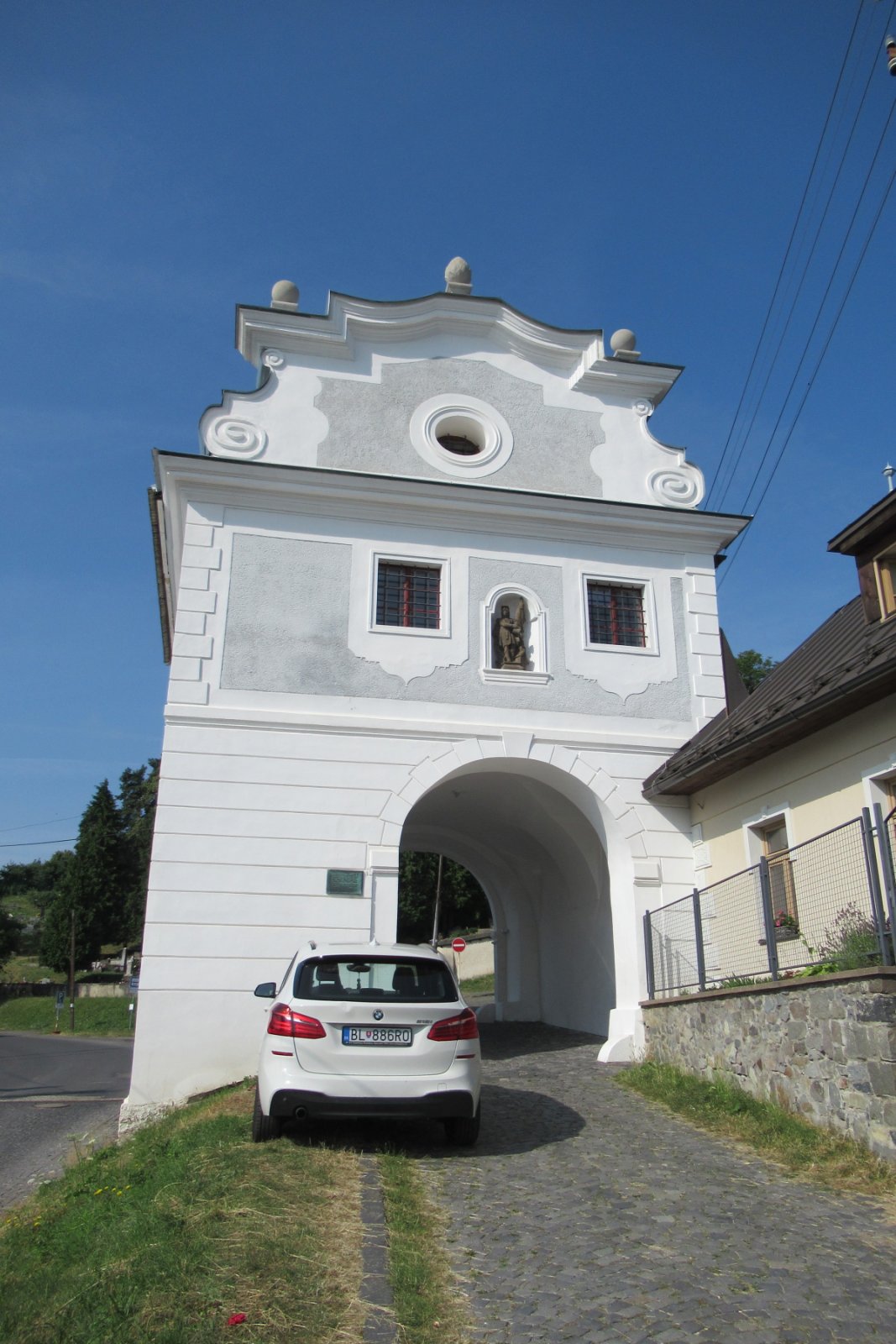 Za kostelem má být i rozlehlá budova fary, původně měšťanský dům ze 16. století. Je prý se sakristií spojena krytou dřevěnou chodbou. O tom jsme nevěděli a nic takového jsme neviděli. Patrně to bude za kostelem z druhé strany – z ulice Jána Palárika – tam jsme asi nebyli.