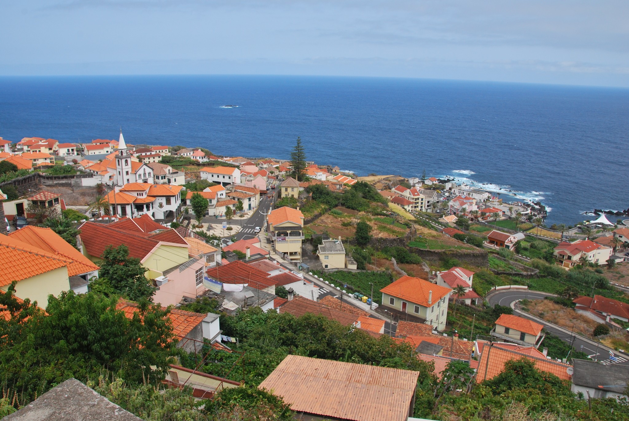 Silnička Caminho da Ladeira se kroutí vzhůru a my funíme do kopce s naloženými batohy na zádech. Občas si u silnice natrháme ostružiny nebo hrozen vína, který je zrovna z dosahu z místních zanedbaných vinic. Chvíli se kocháme výhledem na oceán z téměř tři sta metrů vysoké vyhlídky Miradouro do redondo, ze které máme Porto Moniz pod sebou jako na dlani. Odtud se již stoupání začíná pomalu mírnit. Přesto po silničce Caminho da Assomada nastoupáme ještě dalších více než sto výškových metrů než dojdeme k začátku levády, podél které vede cesta PR15 Vereda da Ribeira da Janela. Touto cestou plánujeme náš další postup hlubokým a širokým údolím říčky Ribeira da Janela.
