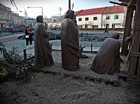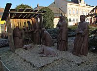 Pod morovým sloupem zůstal z Vánoc umístěn pěkný Betlém se skulpturami svaté rodiny i figurami tří příchozích králů a na zemi se povalujícími oslíky. Po prohlídce zajímavého řezbářského díla jsme pokračovali přes most klenoucí se přes říčku Bratřejovku směrem k zámku. Tady už jsme se dostali na druhý městský rynek – trojúhelníkové Palackého náměstí. Na jeho jižní straně a západní straně se nacházejí hlavní historické památky města, jimiž je kostel sv. Vavřince, budova barokní nemocnice a ve stejném slohu vystavěné objekty předzámčí zámku s hlavním vstupem k bývalému feudálnímu sídlu. Na tyto pozoruhodnosti se ale nemůžeme v klidu pokochat pohledem z jakéhokoliv libovolného místa, neboť kromě malého ostrůvku zeleně v jeho středu je Palackého náměstí v podstatě rušnou křižovatkou!