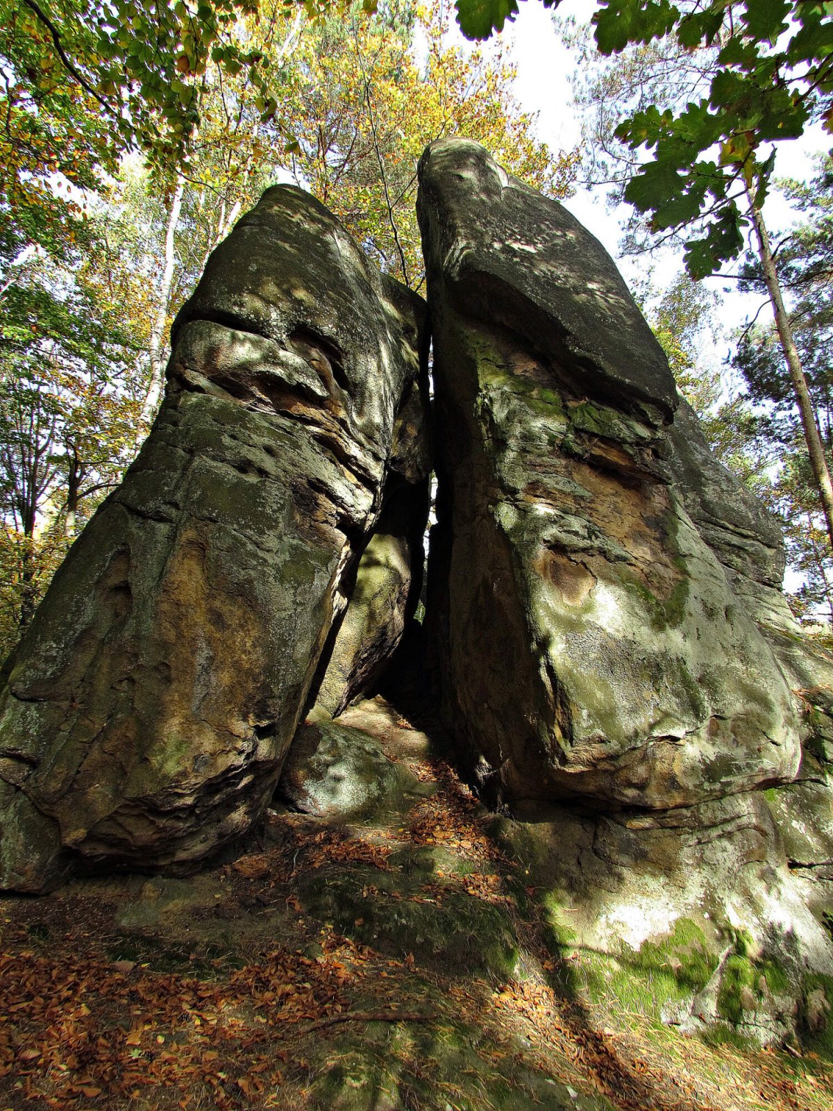 Za pomníkem se lesní cesta u krmelce spojila s komukací, pokračující odsud hvozdem do fryštácké čtvrti zvané „Mexiko“, já ale zamířil dolů po hřebínku k asi 400 metrů vzdáleným skalním útvarům Fryštáckých Čerťáků alias Čertovy skály.