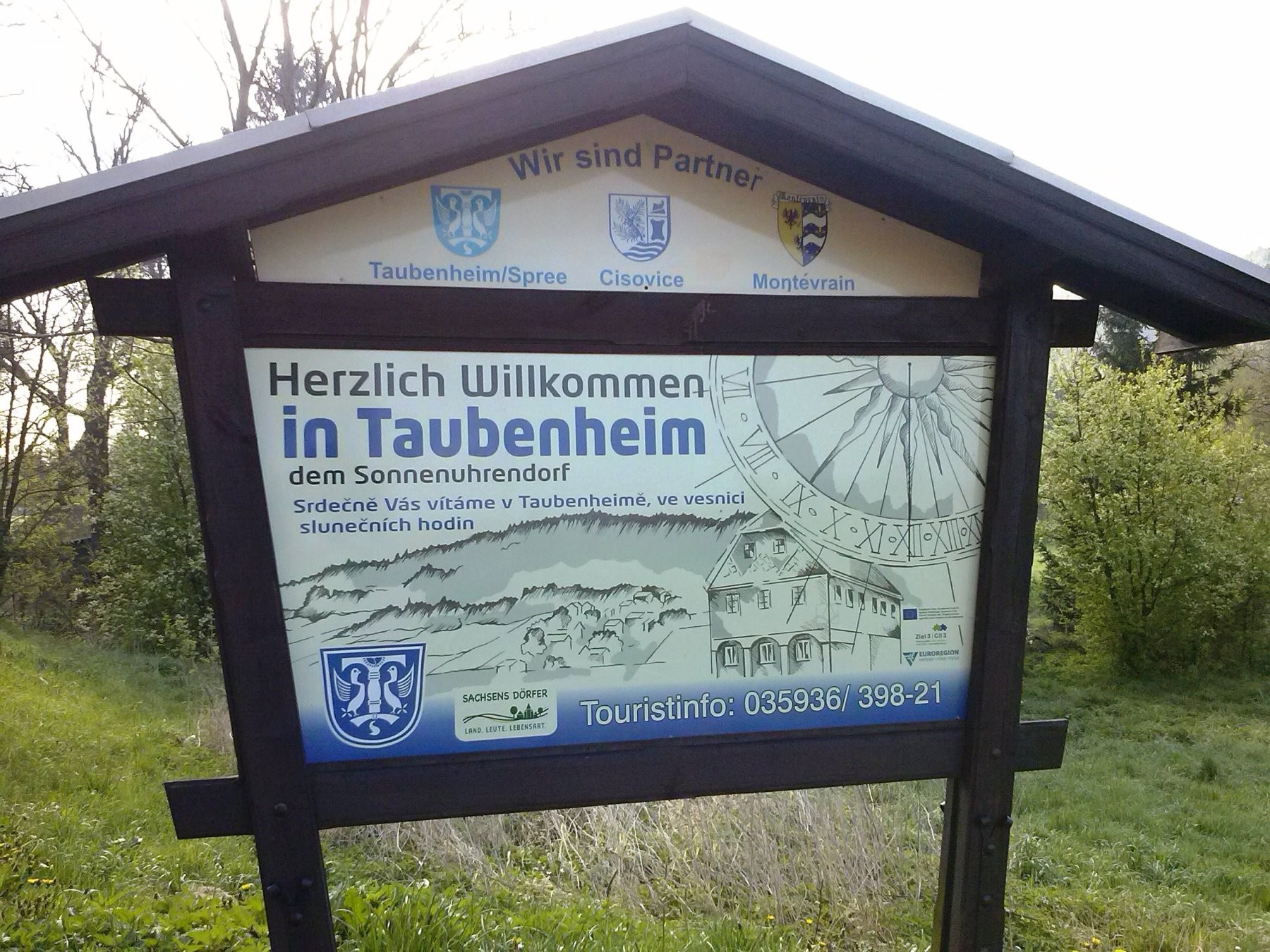S neteří jsme se rozhodly, že projedeme a podíváme se zběžně po zajímavostech po polovině šluknovského výběžku z druhé německé strany. Z městečka Rožany u Šluknova jsme přejely přes Sohland a mířily k Taubenheimu. Ocitly jsme se již v hornolužickém kraji. Cestou jsme několikrát míjely říčku Sprévu. V Taubenheimu jsme nakrátko zastavily, abychom si prohlédly sluneční hodiny, které byly na několika domech, ale bylo to dost z povzdálí a byly docela maličké. Přes pozemek majitele jsme jít nechtěly a na focení z dálky to nebylo nic moc. Sluneční hodiny měly vyznačeny na okrajích domů. Měla jsem o nich jinou představu, neboť toto městečko se výrobou těchto slunečních hodin proslavilo… No jiný kraj a řekla bych spíše i jiné pojetí…Nechtěly jsme zase až tak dopodrobna městečko prohlížet a zkoumat, zda by nešly někde lépe nafotit.