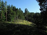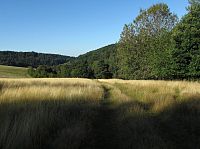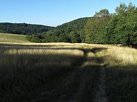 Tady už mé nožky daly asfaltové silnici konečně vale a odpochodovaly po té zpevněné údolím bočního potoka k ohradě, za níž se ukrýval hezký soukromý rybník. Protože byla kvůli plotu cesta dál zatarasena, vyšplhal jsem doprava nahoru do stráně a za remízkem narazil na polní cestu, která okrajem pastviny stoupala nahoru k lesu. Z vyšších poloh lučiny se otvíraly celkem interesantní výhledy, nahoře na hřebínku mne před hvozdem hlasitým bečením pozdravili pasoucí se ovečky.