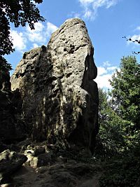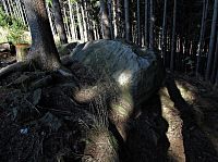 Moje další trasa vedla směrem k Humenci. Zbytečně sestupovat dole na modrou se mi nechtělo, neboť jsem podle map věděl, že se od vrcholu k západu táhne úzký hřeben, při jehož konci jej tur.trasa „dožene.“ Nejprve jsem se musel protáhnout mezi jehličnany hustšího lesa, pak už jsem stanul na okraji hřebínku. Tady mne přivítal hraničník panství pocházející z roku 1886 a za ním po hřebeni procházela pěšina. Záhy mne přivedla k okraji asi 40 metrů dlouhého, přerušovaného mrazového srubu. Mezi balvany tu vystupovaly až 4 m vysoké skalky. Úbočí mrazového srubu spadající na jedné straně k jihu a na druhé k severu, byla pokryta kameny balvanových proudů. Na konci mne překvapilo, jak je tento skalnatý hřebínek uzoučký. Směrem k půlnoci jsem pod sebou viděl chodník tur.modré trasy a na opačné lesní asfaltku rovněž o kus s níž ve svahu kopírující hřeben... a přitom tyto cesty od sebe nedělila vzdálenost větší jak sto metrů! Příjemnou vzpruhou po průzkumné „fušce“ byla kamenná Studánka Pod Vysokým grúněm, jejíž chladivá H20 mi dodala sílu k další pouti.