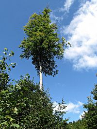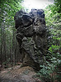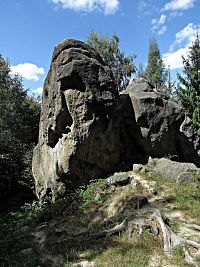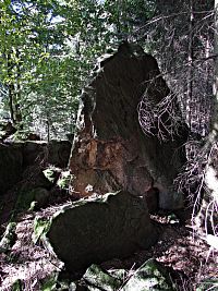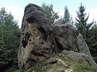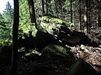 Jenže při této mé dnešní návštěvě jsem je měl problém vůbec najít, protože ve svahu od Tisového nebyly v hustém hvozdu ani kouskem svého kamení k zahlédnutí a navíc zde právě probíhala výstavba nové zpevněné lesní komunikace. Tak se stalo, že jsem musel lesem okolo mokřin sestoupit až k silničce dole v údolí, a poté se na zalesněný ostroh se skálami nazdařbůh vyškrábat jakousi pěšinou. Naštěstí mne zavedla k cíli, ale tady jsem skoro zaplakal nad viděným. Ještě při poslední návštěvě před 12 lety jsem se tu rozplýval nadšením nad tím, že majitel pozemku provedl novou lesní výsadbu na všech stranách až ve vzdálenosti deseti metrů a vlastní skalní areál od náletových dřevin vyčistil. Což dnes už bohužel neplatí. Skalní útvary okolní vegetace zcela přerostla, a proto už nejsou z dáli odnikud vidět.