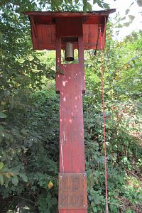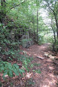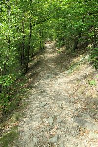 Scházíme dolů po prudké kamenité cestě. Opatrně, terén nevypadá bezpečně, nerada bych uklouzla. Ani Ota nejde rychle. Míjíme rozcestí Červená skalka. Jen tu skalku tu marně hledám. Na rozcestí Pilské údolí, které je na silnici za Černým mostem, nám zbývá 300 m této krkolomné cesty.