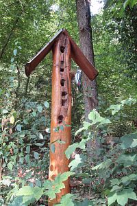 Opět jsme na okraji města. Včera jsme šli po asfaltce a po červené, dnes se držíme naučné stezky, která vede ze stejného rozcestí také po červené, ale vlevo. Po té jsme se včera vraceli.
