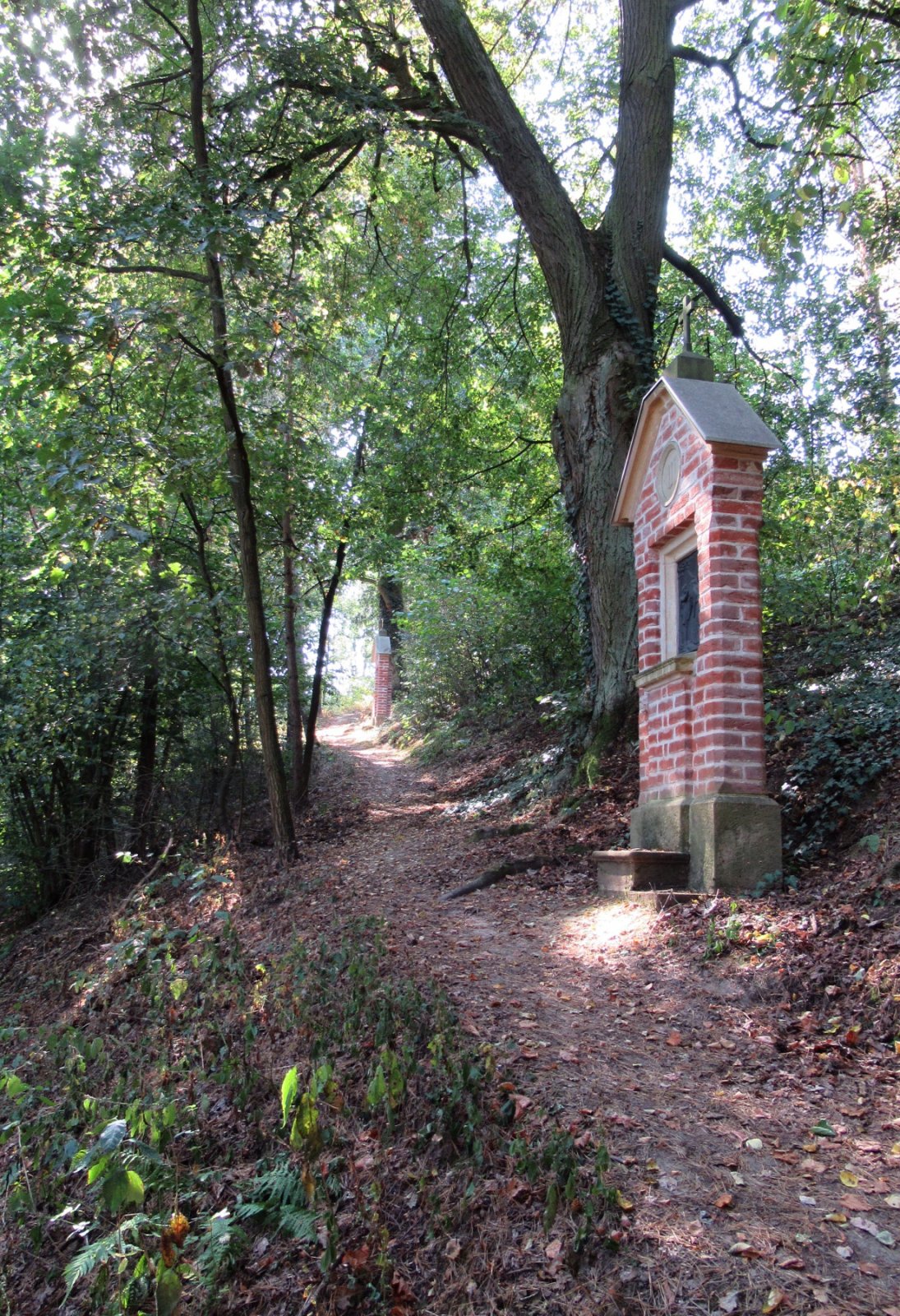 Trasu však zkracujeme. Parkujeme ve stínu na malém parkovišti Zámecké ulici. Abychom si křížovou cestu prošli celou, museli bychom se kus vrátit po hlavní silnici plné aut a ještě po slunci. Ani jedno se nám nelibí. Nemusíme si cestu projít celou. Zajímá nás hlavně její provedeni, architektura. Proto se vracíme od auta po silnici jen kousíček a odbočujeme po lesní pěšině vlevo. Téměř po rovině a ve stínu jsme došli k 6. zastavení. Pět kapliček jsme tedy vynechali. Nyní už pokračujeme po křížové cestě serpentinami vzhůru, je to však mírné. Kapličky jsou hezky opravené, tato křížová cesta se nám líbí. Od 11. zastavení (opět 3 kapličky jsme vynechali) pokračujeme lesem vpravo přímo na vrchol Zámeckého vrchu (377 m), kde je barokní kaple sv. Rodiny o půdorysu pravidelného osmiúhelníku. Byla postavena jako kaple svatojosefského bratrstva r. 1720 - podle letopočtu na portálu. Za josefínských reforem byla zrušena a pustla. R. 1837 byla obnovena jako zámecká kaple. Při budování křížové cesty r. 1864 ji majitelé zámku rod Friesů z Friesenbergu upravili. Kaple fungovala jako hrobka jejich rodu. R. 1925 byly přistavěny dvoukřídlé ambity. Po válce stavba zase chátrala. R. 2012 byla dokončena její oprava a vypadá moc hezky.