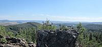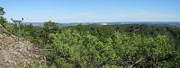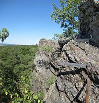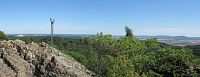 Různě po vrcholu jsou umístěny zajímavé kovové "směrovky" s nápisem, co tím směrem vidíme. S takovým značením jsme se ještě nesetkali. Je vidět Krušná Hora s rozhlednou Máminka, Brdy, Točník, Hudlice, Ota objevil i vysílač Cukrák. Tyto směrovky fungují i jako držáky a tak jsem si nakonec troufla vylézt s Otovou pomocí i na okolní skaliska a podívat se i jiným směrem, což z plošiny nešlo.