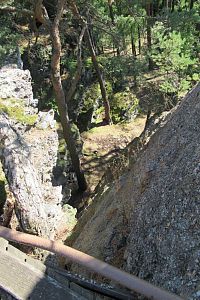 Nakonec jsem se ještě posadila, abych sebrala odvahu k cestě dolů. Ale dolů musím. Je to snad ještě horší než nahoru. Chvíli jdu popředu, častěji se spouštím pozadu. Občas se šoupu po zadku, to když mám pocit, že tu nohu tak hluboko dolů nedám. Po každém těžším úseku vždy jásám. Ani podle toho kovového zábradlí se mi to nezdálo zrovna jednoduché.